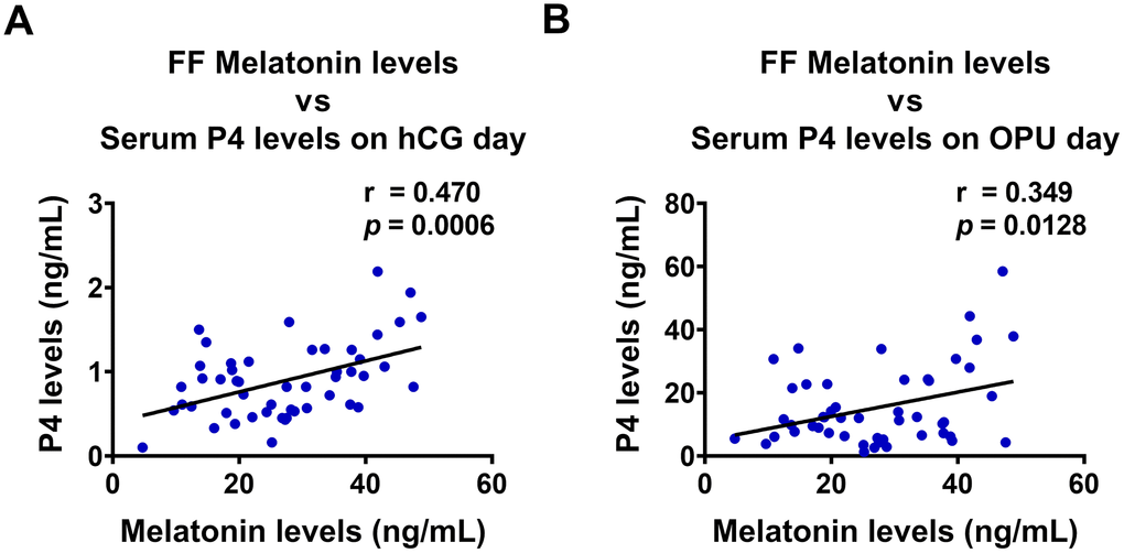 Melatonin levels in follicular fluids were measured using an enzyme-linked immunosorbent assay (ELISA Kit, Abcam, Shanghai, China) in accordance with the manufacturer’s protocol. Serum progesterone (P4) levels were measured using an ELISA Kit (Cayman Chemical, Shanghai, China) as per the manufacturer’s instructions. P4 levels in culture media were normalized to protein concentrations from corresponding cell lysates. For each treatment, normalized culture media P4 levels were expressed as relative values in comparison to control treatment.