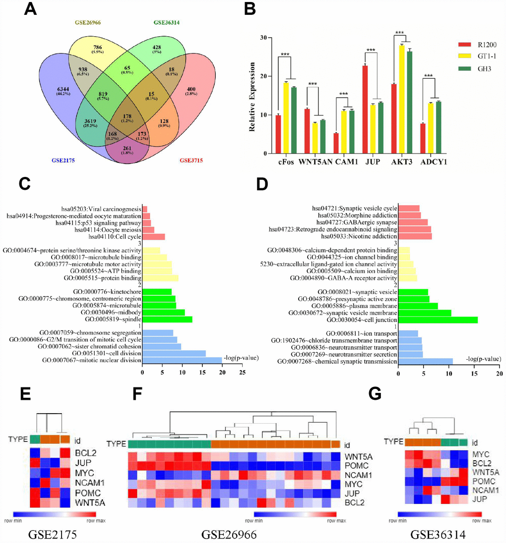 We performed qRT-PCR in order to conform the expression of cFos, WNT5A, NCAM1, JUP, AKT3, and ADCY1 in normal pituitary cells and FPA cells (GT1-1, GH3). NCAM1, cFos, AKT3, and ADCY1 were consistently upregulated in FPA cells compared to normal pituitary cells (P < 0.05) while WNT5A and JUP were downregulated (P < 0.05)., with levels being slightly different across the tested cell lines (showed in Figure 1B).