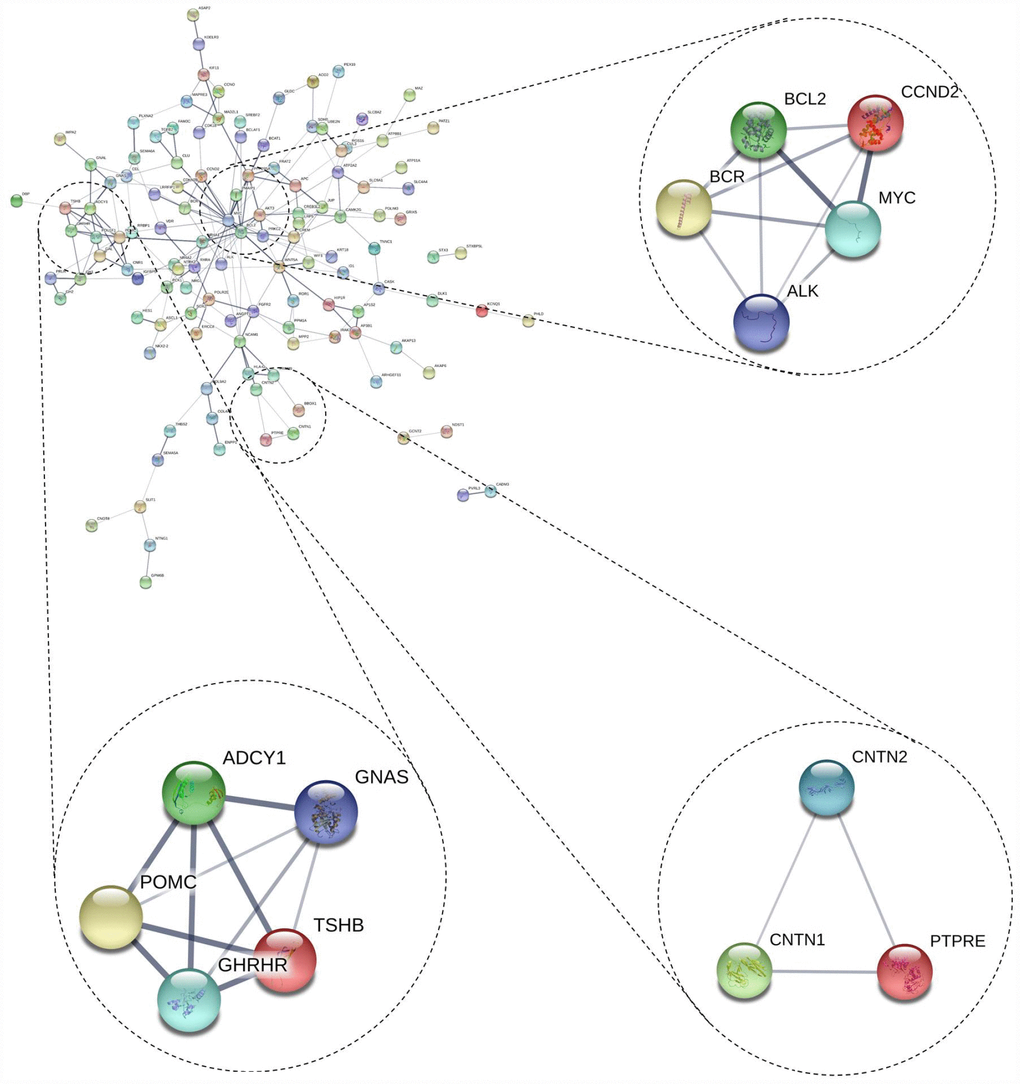 We also conducted PPI network analyses of the previous 178 mutual DEGs. Genes with degrees ≥ 6 were screened as hub genes based on the STRING database. Altogether, 21 genes were identified as hub genes (Figure 1E–1G), including c-Fos, MYC, BCL2, WNT5A, POMC, NCAM1, JUP, AKT3, ADCY1, FGFR2, GH1, CCND2, TSHB, GHRHR, PPP2R5A, BCR, CAMK2G, ATP2A2, APC, and MAD2L1 (listed in Table 2). MYC had the highest degree of nodes, which was 20. Moreover, after MCODE analysis, 157 nodes and 797 edges were obtained, as well as the top three modules (Figure 2), whose functional annotation and enrichment are shown in Table 3. Enriched function analysis revealed that genes in module 1 were primarily related to cell proliferation, protein complex formation, and negative regulation of apoptosis. In module 2, the genes were mainly enriched in activation of adenylate cyclase activity, adenylate cyclase-activating G-protein coupled receptor signaling pathways, and regulation of lipolysis in adipocytes. Finally, for module 3, the genes were involved in glycoprotein binding, anchored component of membrane, and myelin sheath formation.