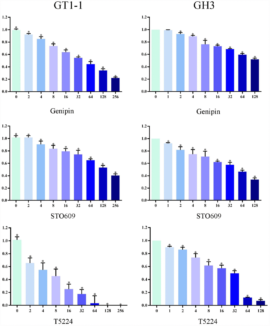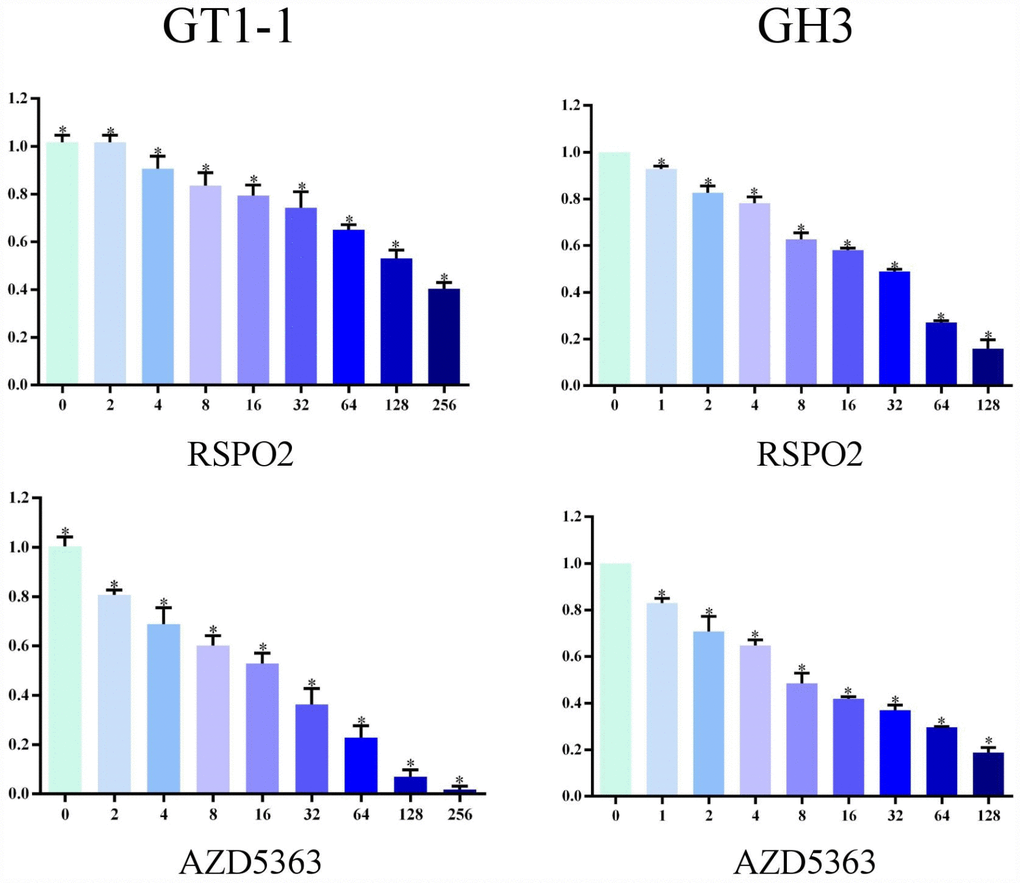 We used MTT assay to measure cell survival after T5224, RSPO2, and AZD5363 treatment. As is shown in Figures 3 and 4, with increasing drug concentrations, cellular viability (ratio to controls) in cell lines GT1-1 and GH3 dropped, decreasing more rapidly for T5224 than for STO609, Genipin (P < 0.05), RSPO2, and AZD5363. Besides, compared to STO609, cellular viability also declined faster for Genipin in cell line GT1-1. However, in GH3 cells, cellular viability was similar for STO609 and Genipin.