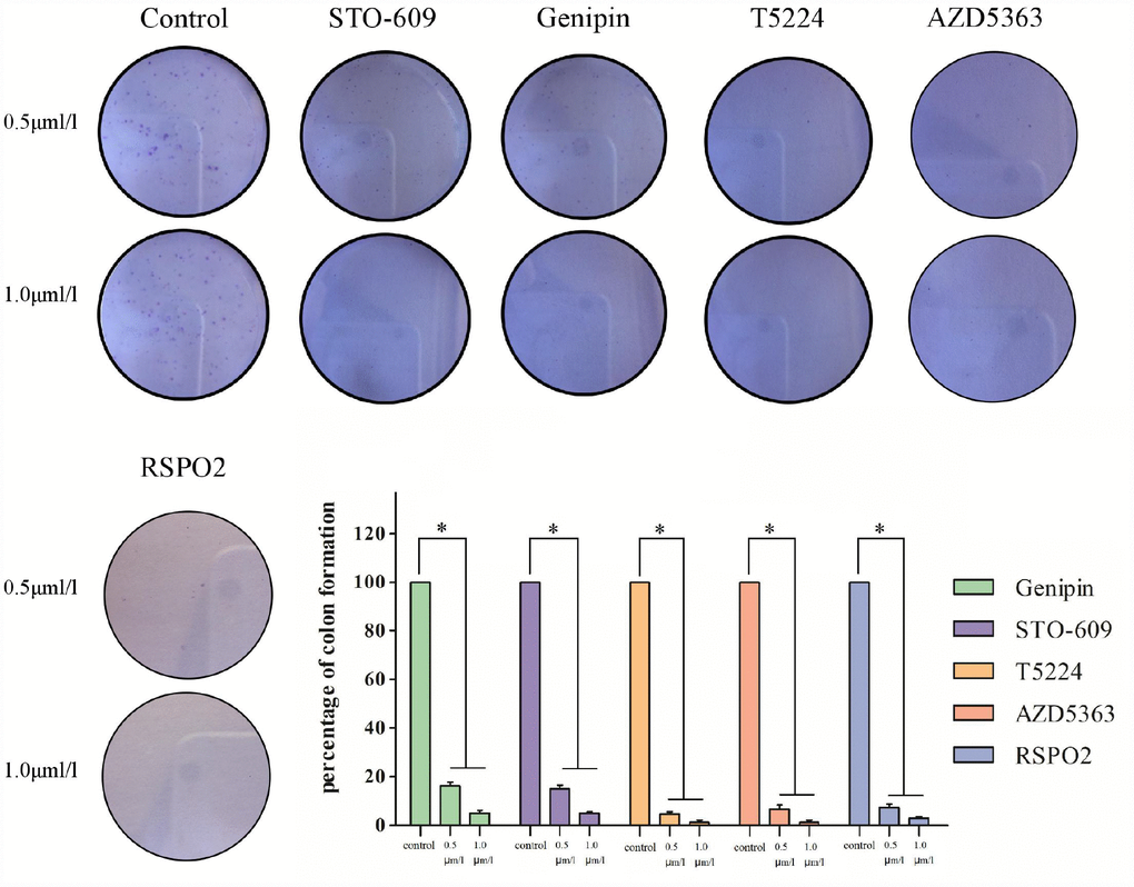 Colony-formation assays revealed different percentages of clone formation for each drug treatment group. Compared to controls, there were fewer and smaller colonies in all drug groups (0.5μmol/L, 1μmol/L). On the other hand, clonogenicities were approximately the same for the STO609 and Genipin groups, both of which were higher than those for the T5224, RSPO2, and AZD5363 groups (P < 0.05) (Figure 5). Higher drug concentrations correlated with fewer clonogenicities, implying dose-dependent effects for T5224, RSPO2, and AZD5363.