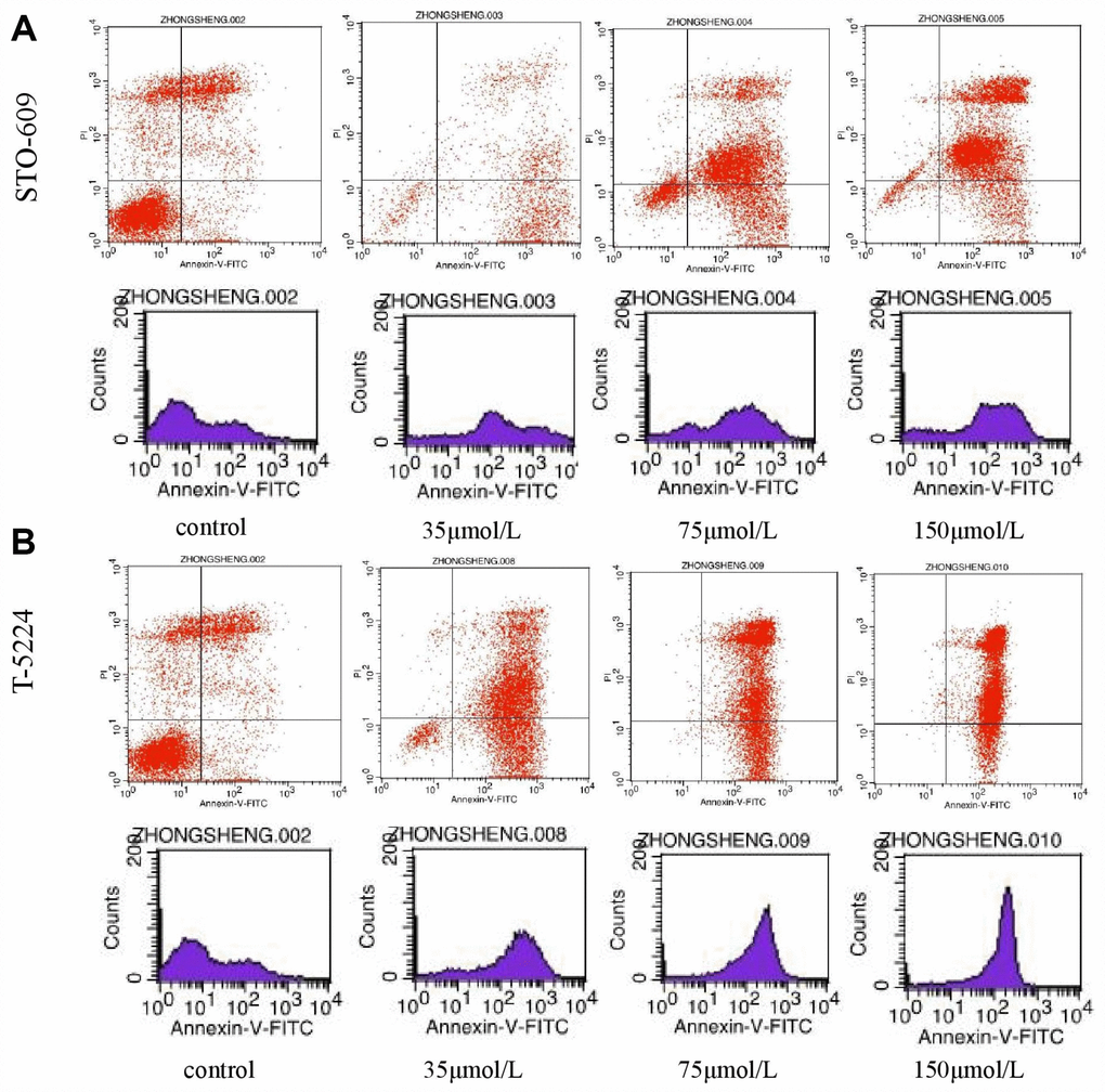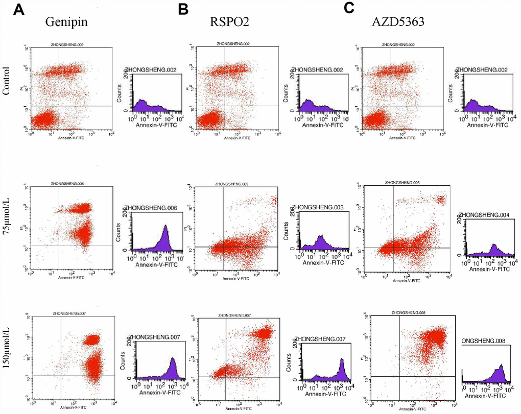 Flow cytometry of FPA cells and controls treated with different doses of drugs for 48 h allowed us to measure the percentages of normal, necrotic, late apoptotic, and early apoptotic cells. For controls, the respective percentages were 57.35%, 16.04%, 21.33%, and 5.28%. On the other hand, for T-5224-treated cells they were 5.69%, 1.08%, 59.74%, and 33.49% in low-dose group (10 μmol/L); 0.36%, 0.55%, 70.23%, and 28.86% in the intermediate-dose group (20 μmol/L); and 0.16%, 0.91%, 83.13%, and 15.8% in the high-dose group (40 μmol/L) (Figure 6A). For STO-609-treated cells, the numbers were 13.37%, 1.73%, 34.72%, and 50.17% in the low-dose group (35 μmol/L); 12.29%, 2.93%, 60.1%, and 24.68% in the middle-dose group (75 μmol/L); and 4.04%, 3.01%, 79.71%, and 13.24% in the high-dose group (150 μmol/L) (Figure 6B). The relevant numbers for Genipin were 0.23%, 1.08%, 97.28%, 1.41% in low dose group (75 μmol/L) and 0.22%, 0.51%, 90.53%, 8.74% in high dose group (150 μmol/L) (Figure 7A). For RSPO2-treated cells, the percentages were 7.19%, 4.15%, 48.04%, and 40.62% in the low-dose group (75 μmol/L), and 1.72%, 6.59%, 90.72%, and 0.97% in the high-dose group (150 μmol/L) (Figure 7B). For AZD5363-treated cells, the percentages were 6.91%, 3.75%, 52.22%, and 37.12% in the low-dose group (75 μmol/L), and 0.24%, 0.71%, 97.32%, and 1.73% in the high-dose group (150 μmol/L) (Figure 7C). We noticed that normal cells were predominant in the control group while apoptotic cells were predominant in the presence of T5224, RSPO2, or AZD5363 treatment. Compared to STO-609-treated cells, there was a greater percentage of apoptotic cells in the T5224, Genipin, RSPO2, and AZD5363-treated groups, even when using the same dose for all drugs.