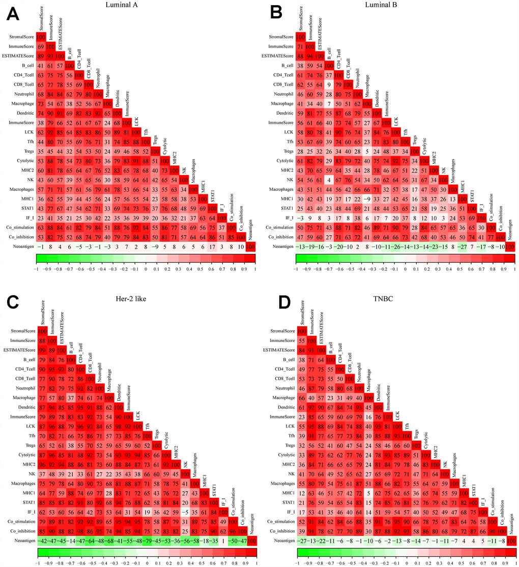 We obtained gene expression data from patients with different breast cancer subtypes from TCGA, and used Spearman correlation coefficients to calculate the correlations between different immune-related scores in these patients (Figure 1A–1D). With the exception of the neoantigen score, all the immune scores exhibited strong positive correlations with one another, especially in patients with the Her-2-like subtype. In all four subtypes of breast cancer, the LCK metagene score exhibited the highest mean correlation score with the other types of immune-related scores (luminal A: 77.7, luminal B: 69.4, Her-2-like: 87.7, triple-negative breast cancer [TNBC]: 76.7). Thus, we selected the LCK metagene as a representative gene in the breast cancer immune microenvironment.