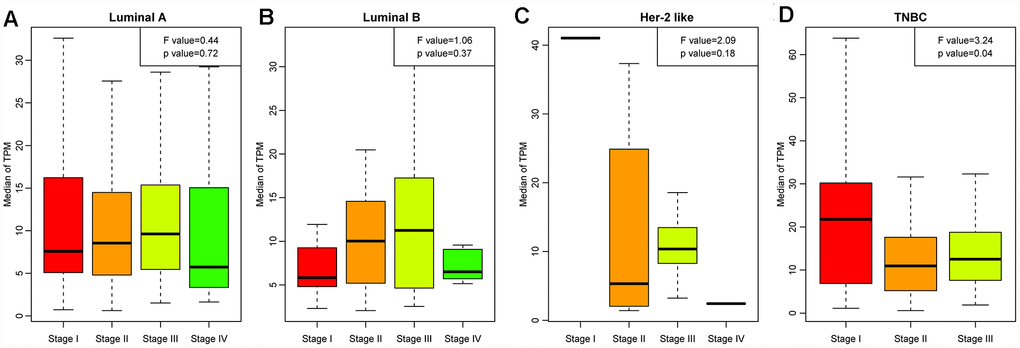 Next, we analyzed the distribution of LCK metagene levels in patients of the four breast cancer subtypes at different clinical stages (Figure 2A–2D). LCK metagene expression was significantly upregulated in stage I in TNBC, suggesting that high LCK metagene expression may be a positive prognostic factor in TNBC.