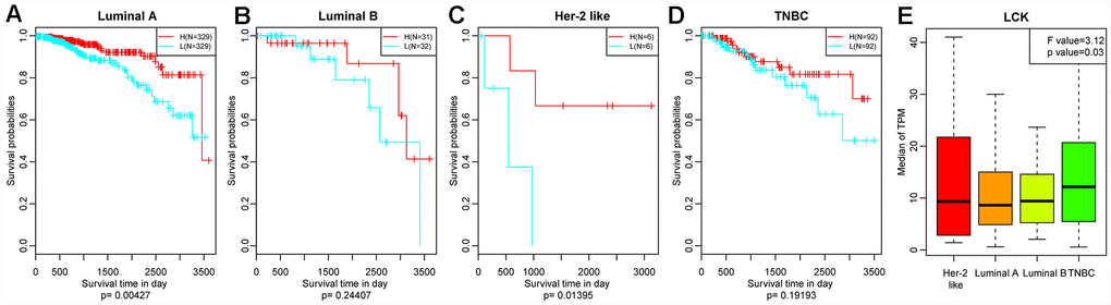 We then divided the patients of each breast cancer subtype into two groups based on the median LCK metagene level, and assessed the prognostic differences between patients with high and low LCK metagene levels (Figure 3A–3D). The prognosis of the high expression group was better than that of the low expression group in all four subtypes. We also observed significant differences in LCK metagene expression among the four subtypes (Figure 3E). The median LCK metagene score was significantly higher in the TNBC group than in the other groups, suggesting that LCK metagene expression can be used as a prognostic marker in breast cancer.