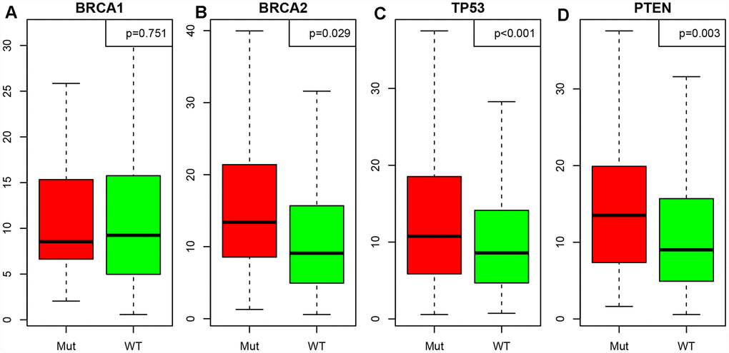 Next, we downloaded single-nucleotide polymorphism data on BRCA1, BRCA2, TP53 and PTEN [12], and divided patients into mutant and wild-type groups. We then determined the LCK metagene expression in each of these groups (Figure 4A–4D). LCK metagene expression was significantly greater in the BRCA2, TP53 and PTEN mutant groups than in their wild-type counterparts, but did not differ significantly between the BRCA1 mutant and wild-type groups.