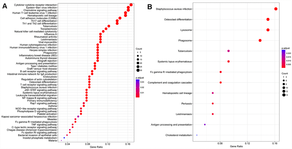 The CD8 antigen is a cell-surface glycoprotein found on most cytotoxic T lymphocytes, and facilitates efficient cell-cell interactions within the immune system. CD8A encodes the CD8 alpha chain, and was one of the 22 immune-related genes identified in this study. Cytotoxic T lymphocytes can recognize and eliminate infected cells and tumor cells. CD8A homodimers on the surface of natural killer cells enable these cells to conjugate with and lyse multiple target cells, thus promoting survival [23]. Higher CD8A expression has been associated with a better prognosis in breast cancer patients [24]. Thus, therapeutically inducing CD8A could enhance the function of cytotoxic T lymphocytes, enabling them to kill more cancer cells.