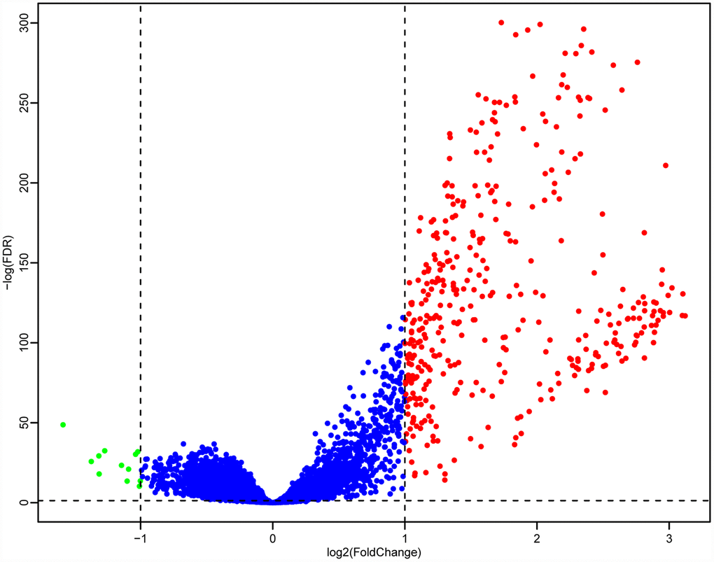 Next, we used the DESeq2 function in the R software package [13] to analyze the genetic differences between the high and low LCK metagene expression groups, and obtained 403 DEGs. The volcano plot is shown in Figure 6. There were significantly more upregulated genes than downregulated genes in the high LCK metagene expression group.