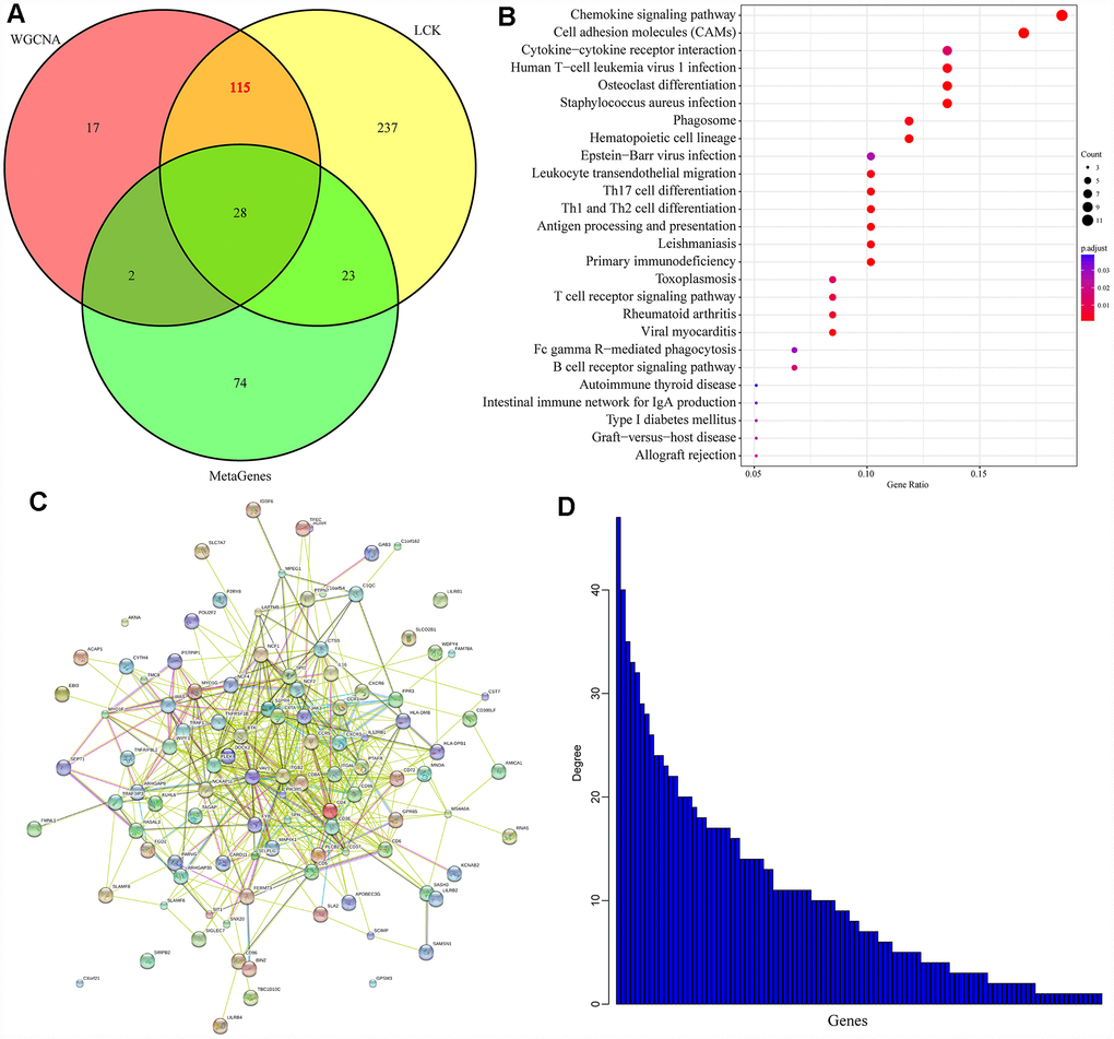 Secondly, taking the gene members of the LCK metagene as the research object, we used a WGCNA to detect representative genes from the relevant gene modules of the LCK metagene. We also analyzed the DEGs between samples with high and low LCK metagene scores to identify co-expressed genes that correlated significantly with members of the LCK metagene in terms of their mRNA levels. Then, we assessed the overlap between these gene sets, and performed a survival analysis to determine which of these co-expressed genes were significantly associated with the prognosis of breast cancer patients. We explored the functions of these genes through an enrichment analysis, and further verified our findings with external data sets. We ultimately found 22 potential immune-related diagnostic and prognostic markers: WAS, ACAP1, SIT1, SEPT1, MAP4K1, CXCR3, TRAC, CD8A, CXCR6, TRBC2, TRAF1, PTPN7, CD3E, TBC1D10C, APOBEC3G, JAML, TRBV28, TRBV7-9, HLA-DPB1, S1PR4, CD6 and CST7.