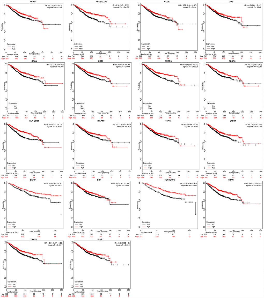 To verify the prognostic value of these 22 genes, we used the breast cancer dataset from the online tool Kaplan-Meier (KM) plotter [15] (http://kmplot.com) to analyze the relationship between the expression of these genes and the overall survival of breast cancer patients. We assessed the 18 genes with available data on the KM plotter platform, and divided the samples into high and low expression groups according to the median mRNA level of each gene. The KM curves of the 18 genes are shown in Figure 8. High expression of these 18 genes was associated with a good prognosis, consistent with our earlier analysis results.