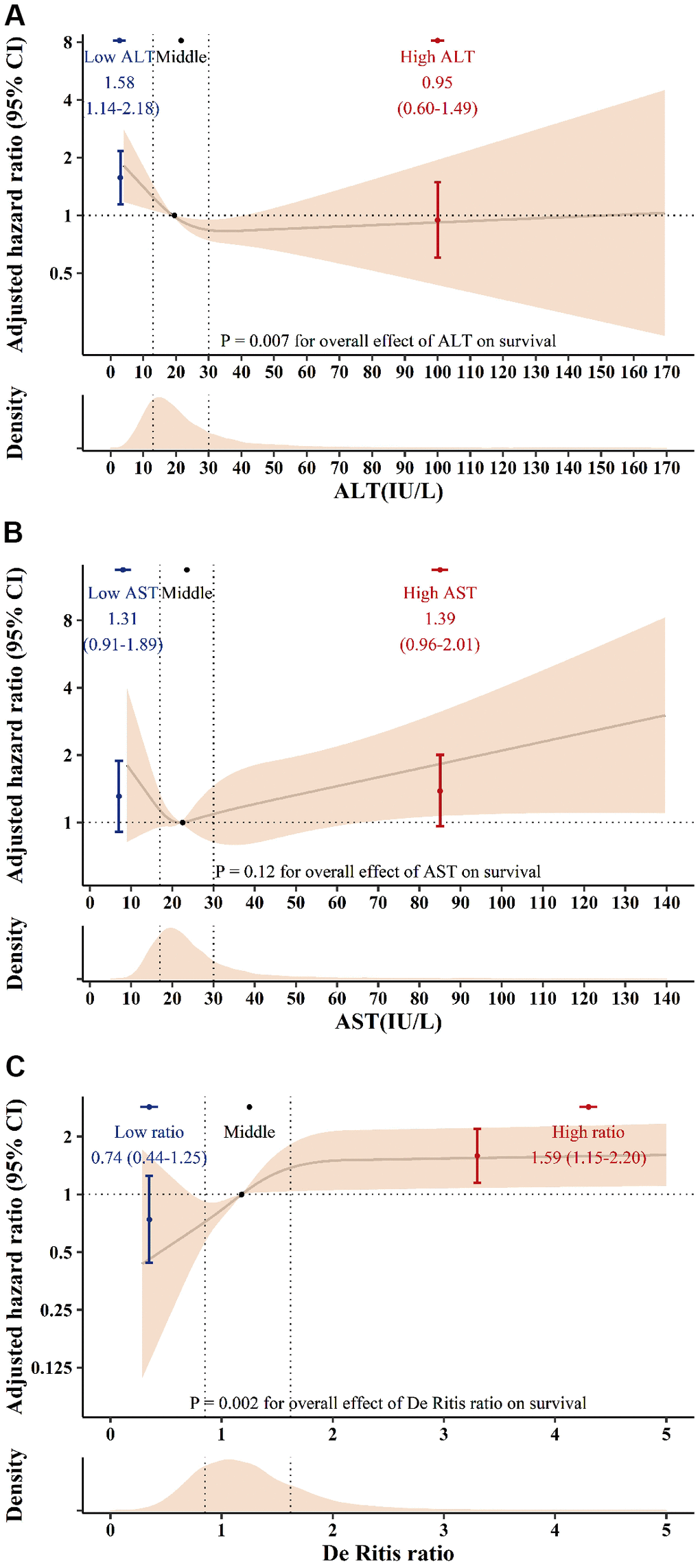Taken together, both low and high preoperative serum aminotransferase levels may be associated with poor outcomes after cardiovascular surgery. To date, no studies have been conducted to verify this hypothesis. Previous studies have only focused on abnormally elevated serum aminotransferase levels or the De Ritis ratio (defined as the ratio of AST/ALT; proposed by Fernando De Ritis in 1957, the ratio has been used to differentiate liver diseases, such as alcoholic hepatitis) in non-cardiac surgery [6, 13–16]. The objective of the present study was to investigate the associations between preoperative serum AST, ALT, and the De Ritis ratio with survival after cardiovascular surgery and to assess whether the mortality risk associated with preoperative serum aminotransferase levels is age-dependent.