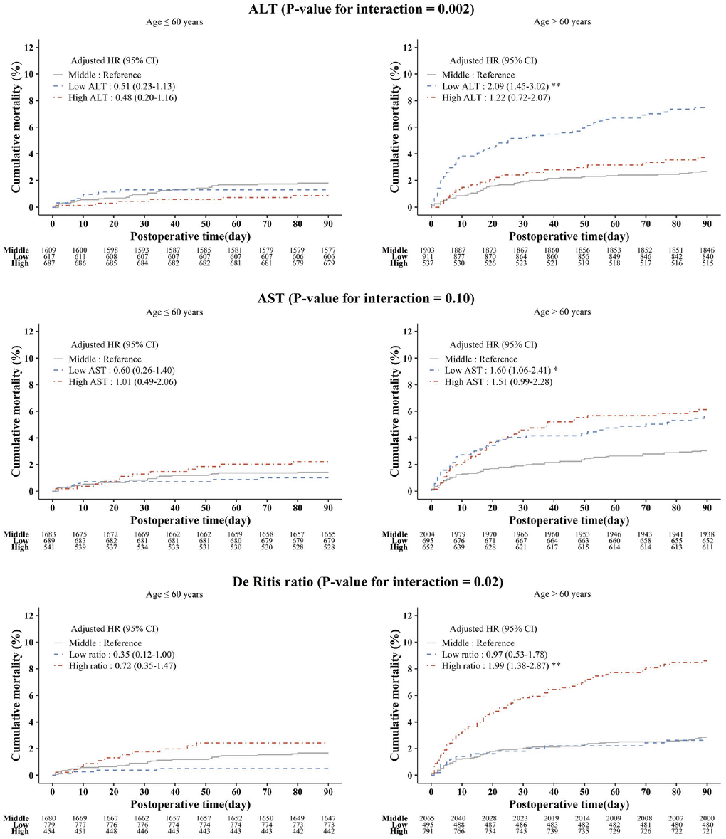 This observational study of 6264 patients who underwent cardiovascular surgery showed that after adjusting for potential confounders, a low preoperative serum ALT level and high De Ritis ratio were associated with increased postoperative 90-day mortality, but preoperative AST levels were not. Furthermore, the relationships of preoperative ALT and De Ritis ratio to postoperative mortality were modified by age, with more pronounced associations in older patients (>60 years). ALT and De Ritis ratio also provided incremental values for risk prediction beyond clinical risk factors.