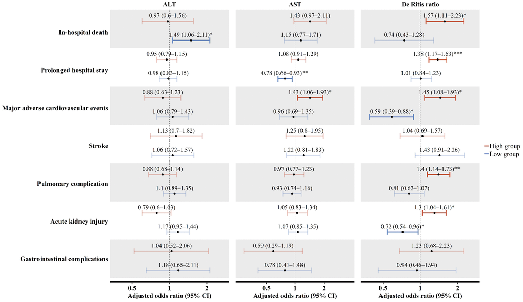 Figure 4 shows the adjusted associations between aminotransferase levels and exploratory secondary outcomes. The preoperative low ALT group was associated with a higher risk for in-hospital mortality. The preoperative high AST group was associated with postoperative major adverse cardiovascular events. The high De Ritis group was associated with a higher risk of in-hospital mortality, prolonged hospital length of stay, major adverse cardiovascular events, pulmonary complications, and acute kidney injury. Our findings were preserved across the sensitivity analyses (Table 4).
