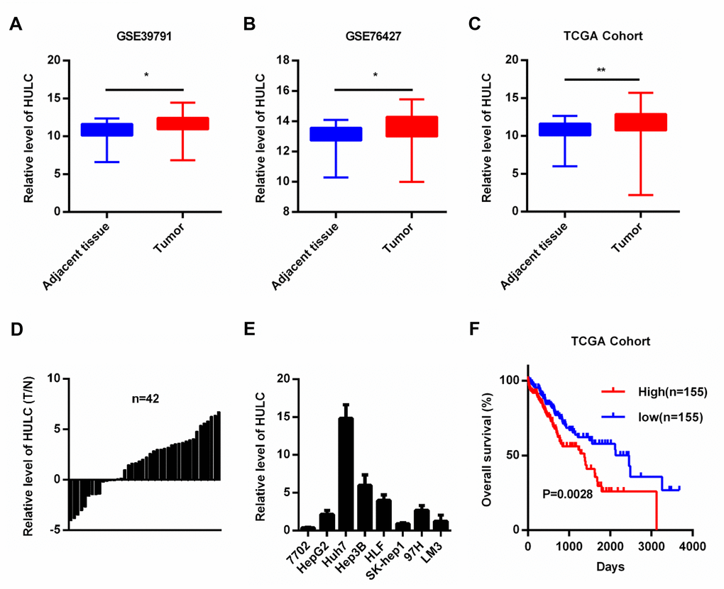 To understand the role of HULC in HCC, we first analyzed HULC expression and HCC patient survival data from the public repositories. We observed higher levels of HULC in HCC tissues compared with controls (adjacent non-tumor liver tissue) in two Gene Expression Omnibus (GEO) datasets (GSE39791 and GSE76427), and The Cancer Genome Atlas (TCGA) cohort (Figure 1A–1C). In addition, we also measured HULC levels in 42 pairs of HCC tissues as well as their matched non-cancerous tissues. Our results showed increased expression of HULC in HCC tissues (Figure 1D). Next, we measured HULC levels in HCC cell lines (HepG2, Huh7, Hep3B, HLF, Sk-hep1, 97H, and LM3) and normal human hepatocyte (7702). HULC was overexpressed in HCC cell lines (Figure 1E). Taken together, these findings indicate that HULC is upregulated in HCC. To determine the prognostic potential of HULC in HCC patients, we generated Kaplan–Meier survival curves for the TCGA cohort. Our results showed that high levels of HULC correlated with poor overall survival (OS) of HCC patients (Figure 1F). These data suggested that HULC might promote tumorigenesis in HCC.