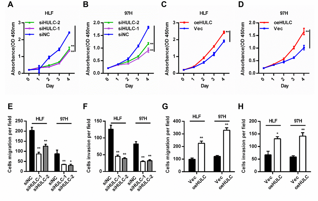 HULC expression was silenced or overexpressed in HLF and 97H cells to investigate the biological function of HULC in HCC cells (Supplementary Figure 1A, 1B). CCK-8 assays indicated that downregulation of HULC led to decreased cell viability (Figure 2A, 2B), whereas overexpression of HULC efficiently enhanced cell viability (Figure 2C, 2D). Additionally, trans-well assays showed that HULC knockdown significantly reduced migration and invasion (Figure 2E, 2F and Supplementary Figure 1C), and overexpression of HULC contributed to migration and invasion of HLF and 97H cells (Figure 2G, 2H and Supplementary Figure 1D). The results above demonstrated that HULC promotes the proliferation, migration, and invasion of HCC cells.
