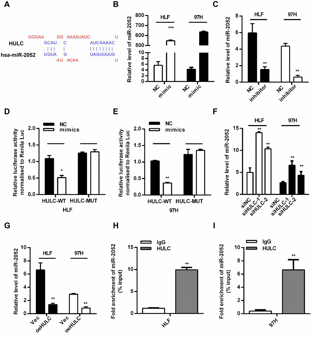 By using bioinformatics predictions (DIANA Tools- LncBase Predicted v.2) [20], we found that HULC might be a ceRNA for miR-2052 (Figure 3A). We overexpressed miR-2052 through miR-2052 mimic transfection (Figure 3B) and silenced miR-2052 through miR-2052 inhibitor transfection (Figure 3C) in HLF and 97H cells. Luciferase reporter plasmid carrying the WT or MUT HULC sequence was cotransfected to measure luciferase activities. Our results showed that miR-2052 mimic transfection decreased the luciferase activity of HULC-WT reporter in HLF and 97H cells; however, mutation of the binding site abrogated this effect (Figure 3D, 3E). Moreover, HULC silencing increased miR-2052 levels (Figure 3F) while HULC overexpression decreased them (Figure 3G), indicating that HULC and miR-2052 inhibit each other’s expression. Additionally, to test whether HULC and miR-2052 engage in direct physical interactions, we performed RNA pull down followed by qPCR analysis. Our results showed that HULC interacted with miR-2052 directly (Figure 3H, 3I), indicating that HULC acts as a sponge for miR-2052 in HCC cells.