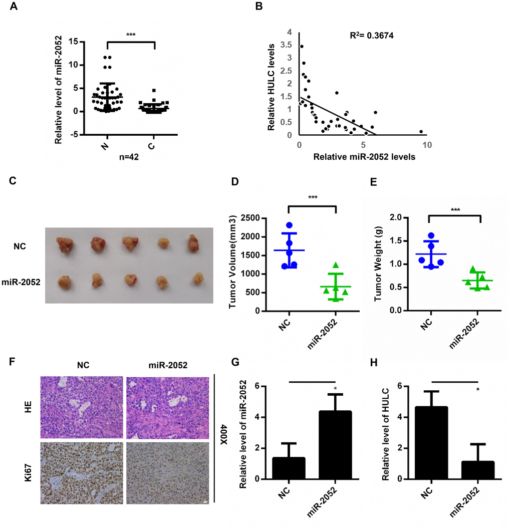 We next measured miR-2052 levels in 42 pairs of HCC and matched non-cancerous tissues. We found decreased miR-2052 levels in HCC tissues (Figure 4A), and miR-2052 expression correlated negatively with HULC expression (Figure 4B). Furthermore, results from CCK8 assays showed that miR-2052 inhibited the proliferation of HCC cells (Supplementary Figure 2A–2D). Additionally, trans-well assay showed that miR-2052 mimic reduced migration of HLF and 97H cells (Supplementary Figure 2E) while miR-2052 inhibitor increased it (Supplementary Figure 2F). Next, we used a xenograft tumor model to explore the role of miR-2052 in vivo. Compared with controls, the weights and volumes of tumors in the miR-2052 group were decreased (Figure 4C–4E). In addition, IHC showed that xenograft tumors expressing miR-2052 displayed lower Ki67 expression (Figure 4F). We then measured miR-2052 and HULC expressions in xenograft tumors by qPCR and found that the HULC expression was decreased while miR-2052 expression was increased (Figure 4G, 4H). These results demonstrated that miR-2052 inhibits the proliferation, migration, and invasion of HCC cells.