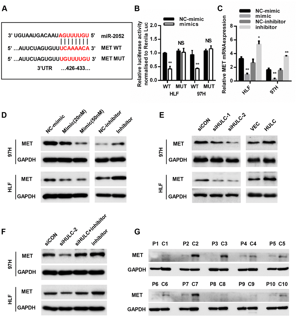 To determine the target genes of miR-2052, we searched four online bioinformatics tools (MicroT, miRDB, miRWalk, and TargetScan) and jointly predicted that four genes may be biological targets of miR-2052 (Supplementary Figure 3A). We tested the regulation of these genes by miR-2052 through qPCR, and chose MET in the end as the focus of subsequent experiments (Supplementary Figure 3B–3C). To further clarify the relationship between miR-2052 and MET, we identified the potential binding sites between miR- 2052 and MET (Figure 5A). Luciferase reporter assay results showed that miR-2052 mimic suppressed the luciferase activity of the MET wild type (WT) reporter, but not that of mutant (MUT) reporter in HLF and 97H cells. Moreover, qPCR and western blot (WB) showed that miR-2052 mimic suppressed, and miR-2052 inhibitor promoted, the expression of MET, respectively (Figure 5C, 5D). These results suggested that MET is a target of miR-2052. Consistently, we found that knockdown of HULC reduced, whereas overexpression of HULC increased MET expression (Figure 5E). Furthermore, inhibition of miR-2052 rescued HULC silencing-mediated downregulation of MET (Figure 5F), indicating that HULC promotes MET expression through sponging miR-2052 in HCC. In addition, WB of 42 pairs of HCC and control tissues revealed that MET was upregulated in HCC tissues (Figure 5G and Supplementary Figure 3D, 3E). Taken together, these results demonstrated that MET is a direct target of miR-2052 in HCC cells.