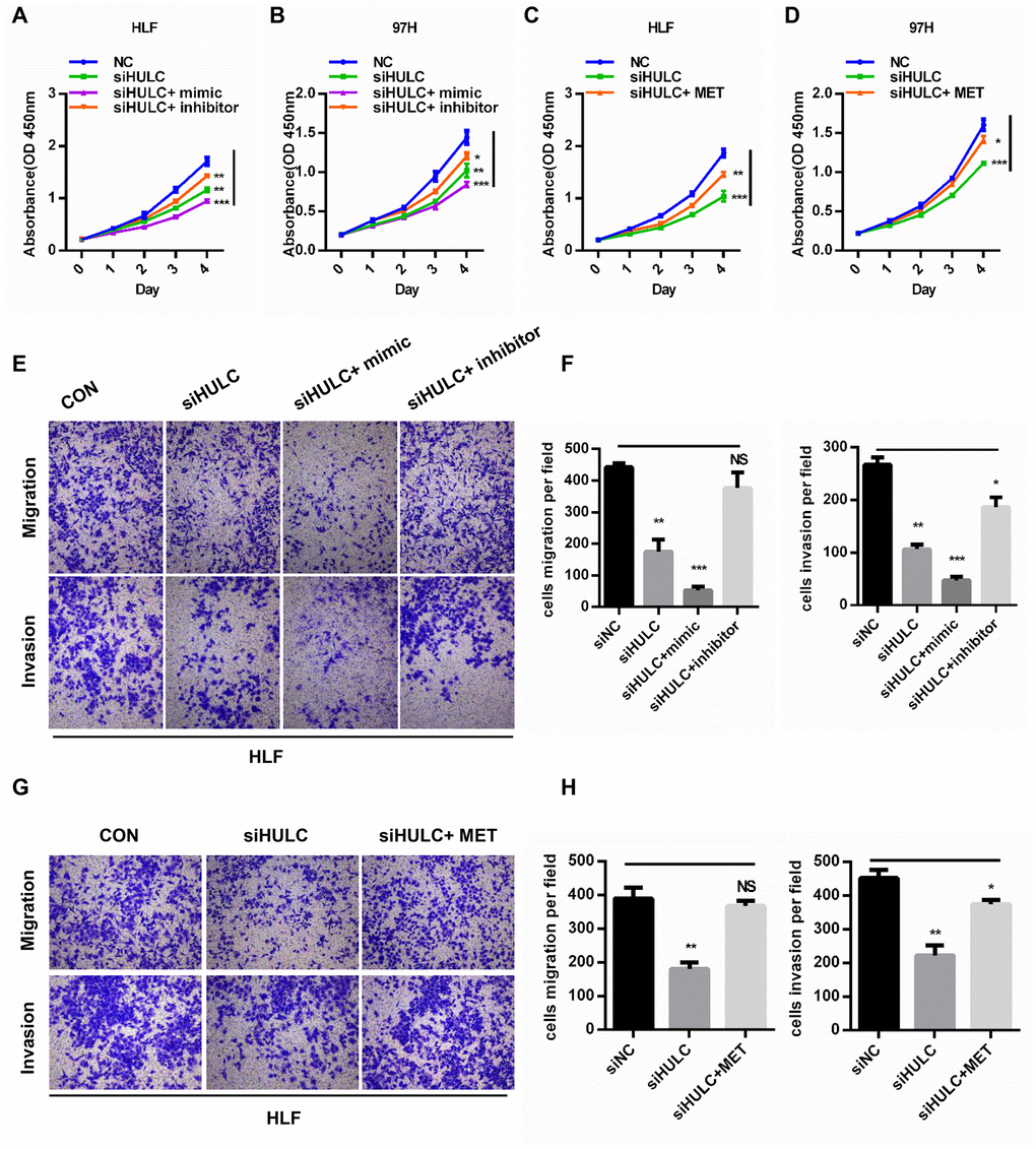 To further test whether HULC promoted HCC progression by targeting the miR-2052/MET axis, we cotransfected miR-2052 mimic or inhibitor together with HULC silencing in HCC cells. CCK8 assays demonstrated that HULC knockdown inhibited the proliferation of HCC cells while restoration of miR-2052 mimic accentuated and restoration of miR-2052 inhibitor abrogated the suppressive effects of HULC silencing (Figure 6A, 6B). Consistently, restoration of MET abrogated the suppressive effects of HULC silencing (Figure 6C, 6D). Transwell migration and invasion assays yielded similar results (Figure 6E–6H). Further analysis showed MET protein expression correlated positively with HULC expression in HCC tissues (Supplementary Figure 3F). Taken together, these results demonstrated that HULC promotes HCC progression through the miR-2052/MET axis.