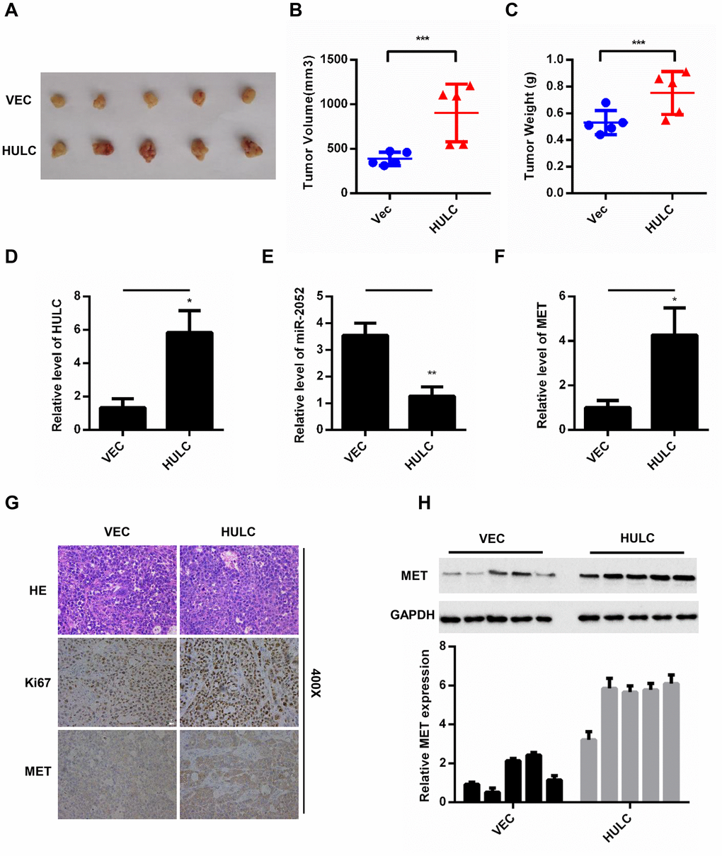 To further analyze the effect of HULC on HCC growth in vivo, we exploited the xenograft mouse model. HLF cells overexpressing HULC have a remarkably increased tumor volume and weight (Figure 7A–7C). In addition, HULC, miR-2052, and MET levels were measured by qPCR in xenograft tumors. The results showed that HULC and MET expression was increased, whereas miR-2052 expression was decreased (Figure 7D–7F). Then, IHC results showed that xenograft tumors overexpressing HULC displayed high Ki67 and MET expression (Figure 7G). Moreover, we also measured MET expression in xenograft tumors by WB and the results showed that MET was increased in cells overexpressing HULC (Figure 7H). Taken together, these results indicated that HULC promotes HCC growth through the miR-2052/MET axis in vivo.