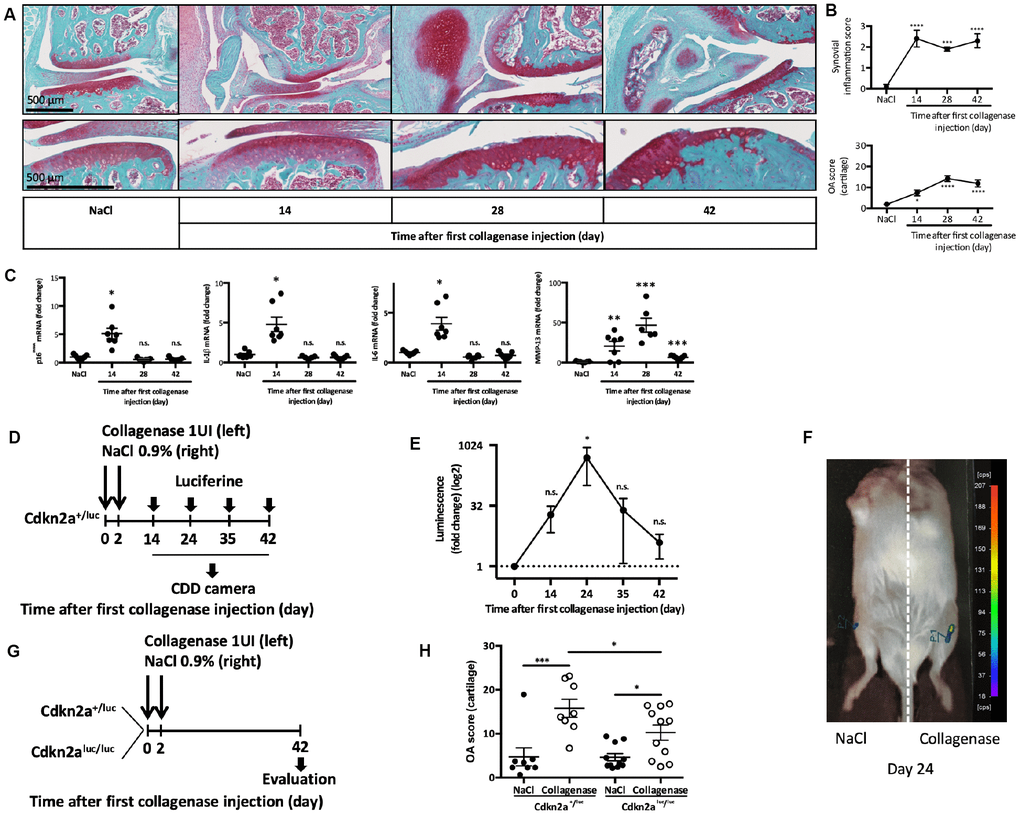 First, we wanted to monitor the appearance of senescent cells after OA induction in the collagenase-induced OA (CIOA) model [14], which mimics joint inflammation and synovitis that are observed in 1/3 of patients with OA [5]. To this aim, we performed intra-articular injection (at day 0 and day 2) of collagenase type VII in the left knee and saline solution in the right knee of 2-month-old C57BL/6JRj male mice, as previously described [15], and collected joints at day 14, 28 and 42 post-injection. Analysis of cartilage degradation (OA score) and synovitis, showed progressive cartilage degradation and early synovial activation (Figure 1A and 1B) in the collagenase-injected joint, but not the NaCl control ones.