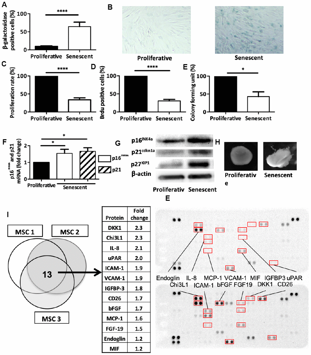 The secretome of senescent and proliferating MSCs was analyzed with the Protome Profiler Human XL Cytokine Array Kit (R&D Systems; ARY022B) according to the manufacturer’s instructions for the parallel determination of the relative level of 105 human cytokines, chemokines, and acute phase protein. Capture antibodies were spotted in duplicate on nitrocellulose membranes to bind to specific target proteins present in the cell supernatant. Captured proteins were detected with biotinylated antibodies and visualized using chemiluminescence detection reagents. For western blot analysis, proteins were isolated from cultured MSCs using Lysis buffer 17 (R&D systems; 895943), supplemented with protease inhibitors (Roche; 11 873 580 001), according to the manufacturer's instructions. Protein concentration was estimated using the BCA Protein assay (Fisher Scientific; 10678484) and 50μg of total proteins was loaded per well after denaturation in Laemmli blue with beta-mercaptoethanol (at 95°C, for 7min). Samples were resolved through Mini-PROTEAN® TGX™ 4-15% gradient gels (Bio-Rad: 456-1084) in Tris-glycerin buffer, and then were transferred to polyvinylidene fluoride (PVDF) membranes (Bio-Rad Transblot® Turbo™: 170-4157) using the Bio-Rad Transblot® Turbo™ system (1.3A – 25V – 7 min). After transfer, membranes were washed in Tris-buffered saline (TBS), blocked in 5% non-fat dry milk in TBS-0.1% Tween 20 (TBST) at RT for 1 hour, followed by incubation with primary antibodies at 4°C overnight, except for the anti-β-actin antibody (RT for 3h). The following primary antibodies were used: rabbit IgG anti-human p16 (1:750 in 5% NFDM-TBST, Proteintech; 10883-1-AP), rabbit IgG anti-human p21 (1:1000 in 3% BSA-TBST, Abcam; 109199), mouse IgG anti-human p27 (1:200 in 5% NFDM-TBST, Abcam; 193379), rabbit anti human β-actin (1:1000 in 5% BSA-TBST, Abcam; ab8226). After incubation, membranes were washed in TBST and incubated with goat anti-rabbit IgG (1:2000 in 5% BSA-TBST; Cell Signaling, 7074) or goat anti-mouse IgG (1:2000 in 5% BSA-TBST, Cell Signaling; 7076) horseradish peroxidase (HRP)-conjugated at RT for 2h. Reactions were visualized using the Immobilon ECL HRP Substrate (Millipore; WBLS0500).