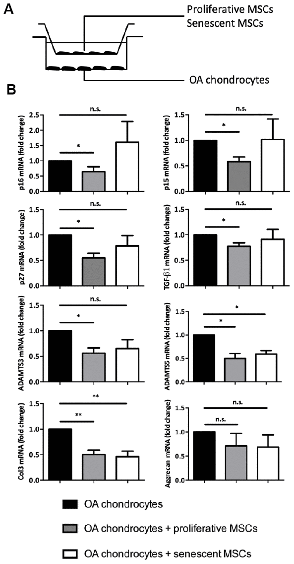 To maintain articular homeostasis following cartilage injury, MSC rely also on their paracrine chondroprotective properties toward functionally-altered chondrocytes. For instance, using trans-well co-culture systems, previous studies have shown that MSCs can reduce the expression of some hypertrophy and fibrotic markers in OA chondrocytes [8]. To determine whether senescence could change this central MSC tissue support function, we co-cultured for 7 days, using the same trans-well setting, OA chondrocytes with proliferative (control) or senescent p16INK4a-positive MSCs (Figure 3A). As previously published, control MSCs significantly reduced, in OA chondrocytes, the expression of TGF-β1, ADAMTS3 and ADAMTS5 three hypertrophic markers associated with the SASP as well as the fibrotic marker collagen 3 (Col3) (Figure 3B). Remarkably, although the secretory profile of these MSCs neither promote the re-expression of aggrecan (Figure 3B) nor collagen type 2 expression in OA chondrocytes (data not shown), it can nevertheless reduce the expression for senescence-associated cell cycle inhibitors namely p16INK4a, p15INK4b and p27KIP1 (Figure 3B). Our results emphases then a chondro-protective, anti-fibrotic but also an anti-senescent paracrine effect for these stem cells towards OA chondrocytes. However, when senescent, MSCs retain only their anti-fibrotic properties by repressing Col3 but loss their suppressive capacities on p16INK4a, p15INK4b p27KIP1 and the SASP factors TGF-β1 and ADAMTS3 in OA chondrocytes (Figure 3B). Thus, MSC seno-suppressive paracrine effect is strongly affected upon senescence onset arguing here that senescent MSC maintains and/or participates to chondrocytes loss of function during OA progression or cartilage aging.