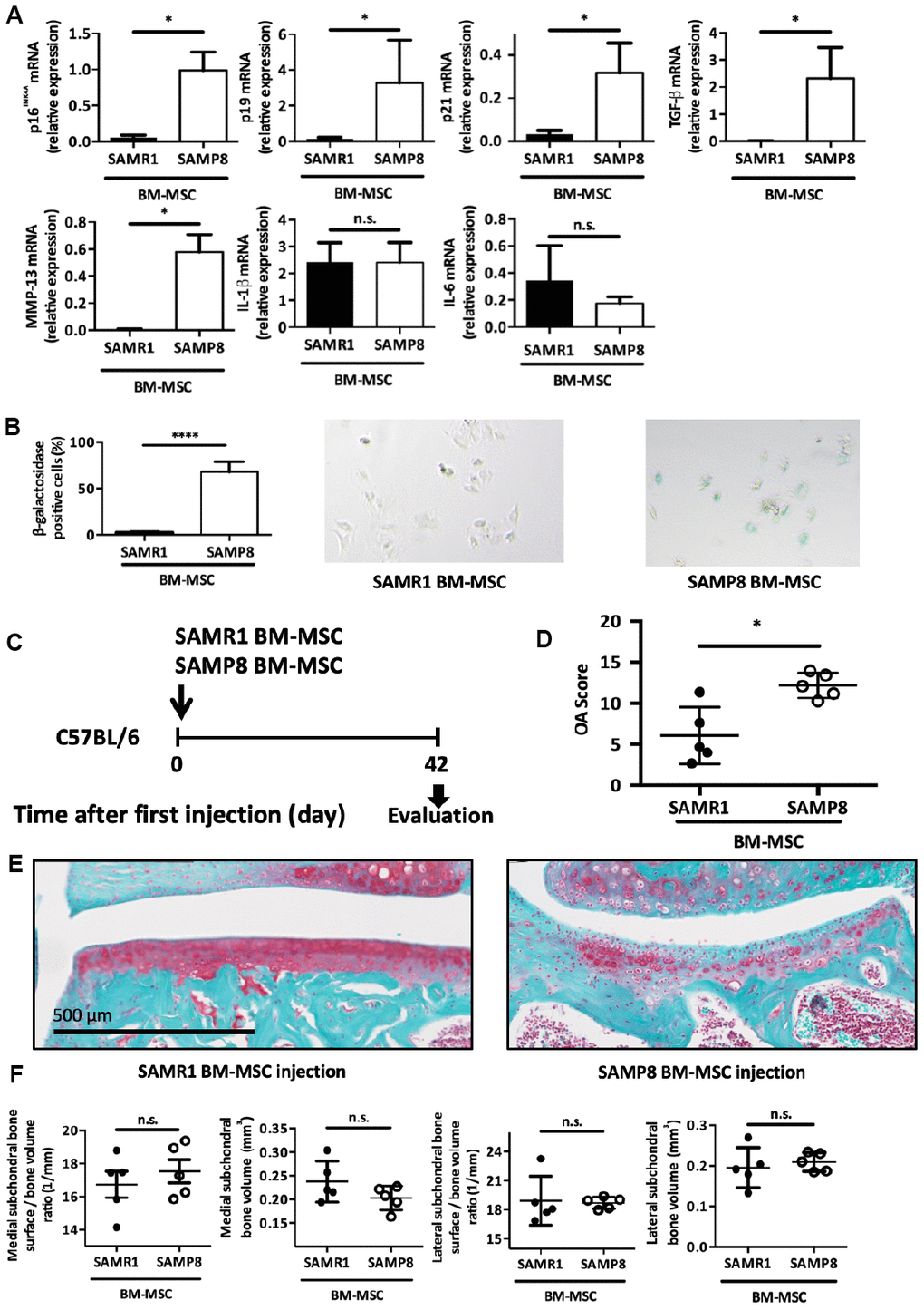 We next wanted to link premature OA development in these SAMP8 mice and the presence of senescent MSCs. To this aim, we isolated enriched mesenchymal stromal/stem population from 6-months SAMP8 and SAMR1 mice after bone marrow flushing, and 2 weeks of selection for cell culture adhesion as previously published [32]. Several cell cycle inhibitors associated with senescence state such as p16INK4a, p19ARF and p21Cdkn1a, and some SASP factors namely TGF-β1 and MMP-13, were upregulated in SAMP8 MSCs compared with SAMR1 MSCs (Figure 5A) [18, 33, 34]. As expected for senescent cells, these SAMP8 MSCs showed also an increase in SA-β-galactosidase activity (Figure 5B) but a surprisingly non-classical inflammatory SASP as demonstrated by absence in IL-6 and IL-1β expression levels (Figure 5A). Then, to challenge our hypothesis whether senescent MSCs can contribute to OA development, we intra-articulary delivered 2.5x105 MSCs from SAMP8 or SAMR1 mice in 2-month-old C57BL/6JRj male mice at day 0. At day 42 post-injection, each injected mouse was sacrificed and dissected joints analyzed as in Figure 4 (Figure 5C). Histological analysis after Safranin-O/Fast green staining showed that injection of SAMP8 MSCs strongly promoted cartilage degradation compared with SAMR1 MSCs (mean OA score = 12.2 ± 0.7 and 6.1 ± 1.6, respectively; p<0.05) (Figure 5D and 5E). Furthermore, subchondral bone analysis by micro-CT revealed, even if not significant, a trend toward a higher bone surface/bone volume ratio and a lower subchondral bone volume in the medial compartment in SAMP8 MSCs injected mice (Figure 5F). These results demonstrate that senescent MSCs are sufficient to trigger alone cartilage and joint dysfunction in young wild-type mice, similar to the phenotypes observed in senescence-accelerated SAMP8 mice and in human patients.