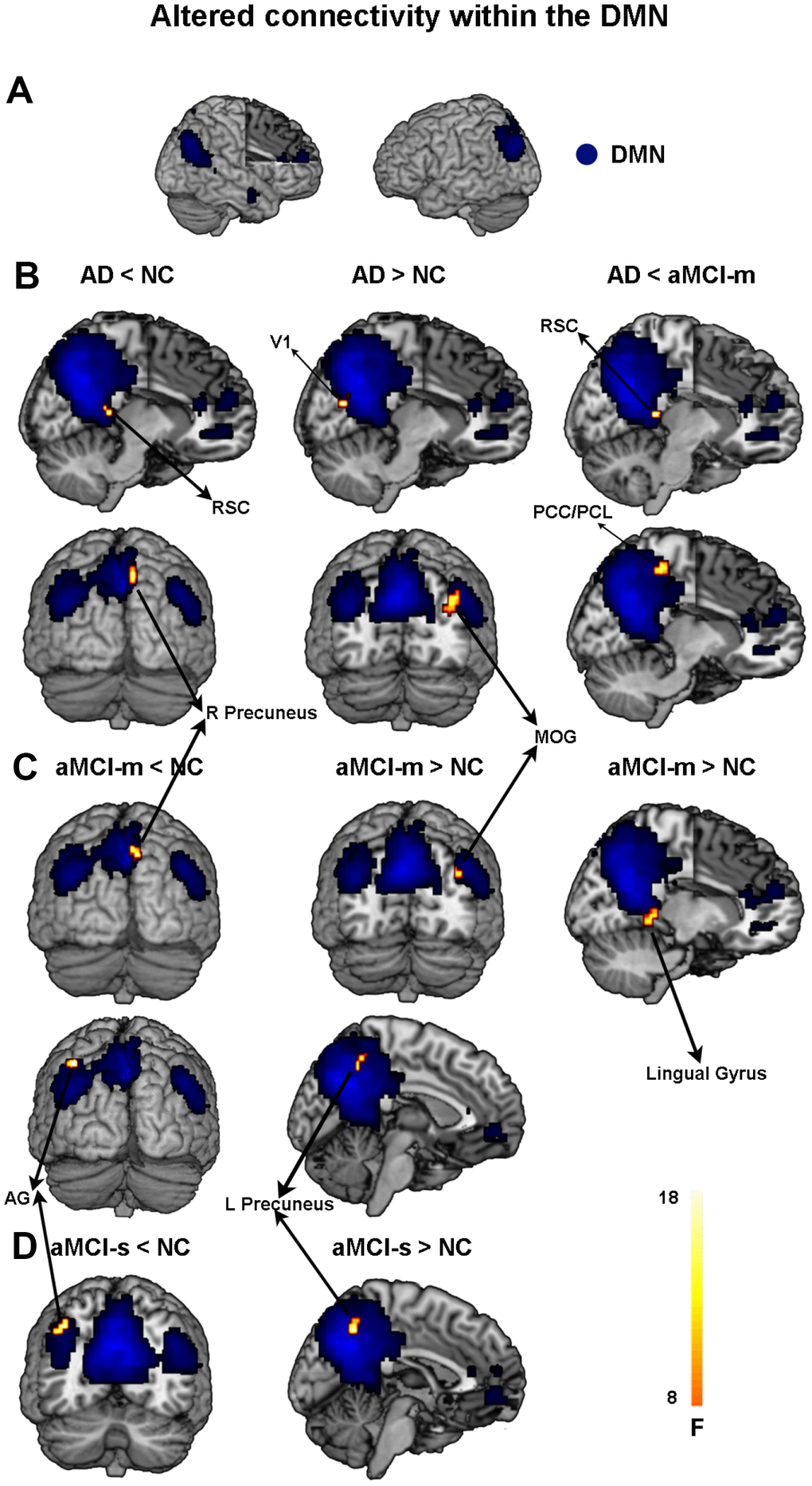 Besides hypoconnectivity, we also observed hyperconnectivity within the DMN in subtypes of aMCI and AD groups relative to NC. Compared with NC, AD showed significantly increased positive functional connectivity than NC in the right middle occipital gyrus and right primary visual cortex (Figure 1B and Supplementary Table 2). The aMCI-m group showed significantly increased positive functional connectivity in the left precuneus, right middle occipital gyrus and right lingual gyrus compared to NC (Figure 1C and Supplementary Table 2). The aMCI-s group only showed significantly increased positive functional connectivity in the left precuneus (Figure 1D and Supplementary Table 2).