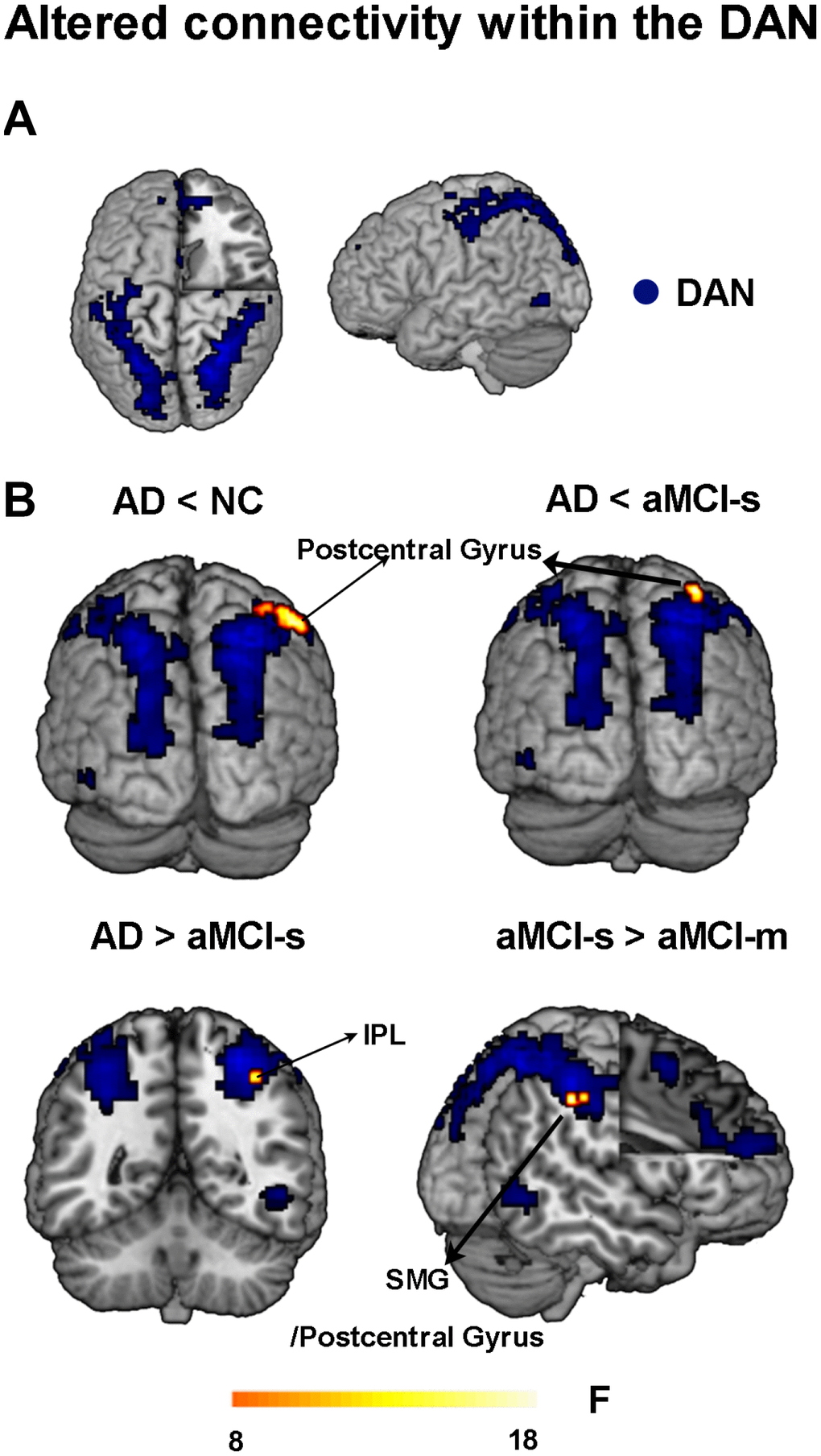 The aMCI-m and aMCI-s groups revealed decreased functional connectivity in the left angular gyrus compared to NC. A previous study demonstrated that the left angular gyrus is critical for episodic memory [57]. Our results showed that the aMCI-s group only had decreased functional connectivity in the left angular gyrus compared with NC, which is consistent with the definition of isolated memory impairment. Furthermore, we also found that the AD group showed reduced functional connectivity in the right retrosplenial cortex and the right PCC within the DMN compared to the aMCI-m group and had decreased functional connectivity in the right postcentral gyrus within the DAN compared to the aMCI-s group. The aMCI-m group showed decreased functional connectivity in the right supramarginal gyrus extending to the right postcentral gyrus compared to the aMCI-s group. Considering the aforementioned findings, our results supported a gradient of functional deficits. Observed hypoconnectivity in the aMCI-s, aMCI-m and AD groups relative to NC may reflect different levels of impairment among a variety of cognitive domains during the progression from MCI to AD. Preserved functional connectivity within the DMN and DAN may represent internal potential to maintain a reciprocal pattern between the DMN and DAN.