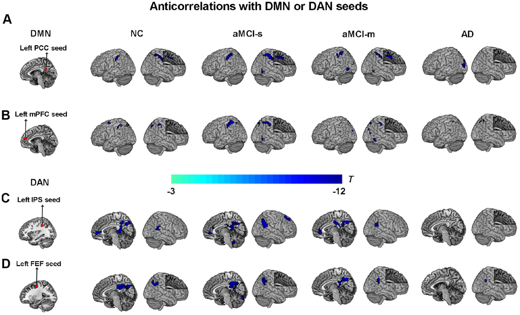 Overall, the present study provides evidence that hypoconnectivity in specific regions of both the DMN and DAN and hyperconnectivity in areas outside the typical networks were observed in aMCI-s, aMCI-m and AD groups, which may subsequently disturb functional interactions between the DMN and DAN. Furthermore, aMCI-s and aMCI-m groups showed different magnitudes of enhanced anticorrelation between the DMN and DAN, and then, the anticorrelation strength in the AD group dropped to nearly zero. This phenomenon suggested a gradient of DMN-DAN anticorrelation attenuation during the progression from MCI to AD. Finally, the dysfunctional anticorrelation between the DMN and DAN in subtypes of aMCI may have a large impact on behavioral performance. These results are important for understanding the adaptations in brain function during the progression of AD, and DMN-DAN anticorrelation may serve as a potential biomarker to detect AD in the preclinical stage.