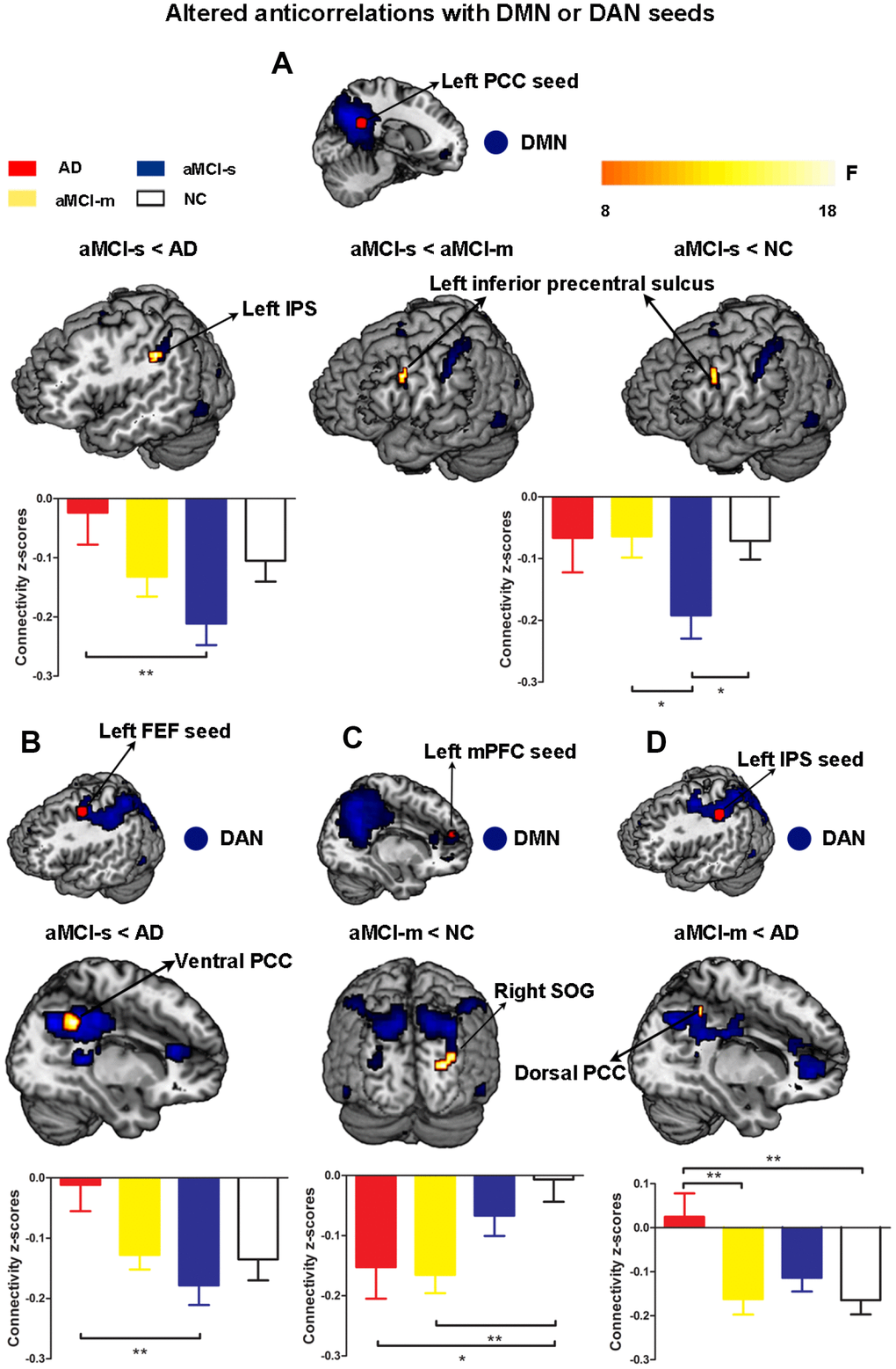 In the current study, we aimed to characterize the alterations in functional connectivity between the DMN and DAN in subtypes of aMCI by comparing these patterns with the same functional patterns in healthy elderly individuals and patients with AD. Given that aMCI-s is an earlier stage of AD than aMCI-m, it is hypothesized that dysfunctional connectivity between the DMN and DAN may reveal a trend of gradual decline from MCI to AD. To test whether the dysfunction within the DMN and DAN may subsequently disturb functional anticorrelation between the DMN and DAN, we also examined altered functional connectivity within the DMN and DAN in subtypes of aMCI and AD.