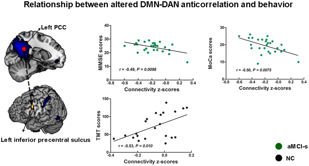 Finally, we examined the relationship between cognitive domains and the altered anticorrelations between the DMN and DAN among the four groups. The connectivity strengths between the left PCC and left IPS showed negative correlations with the BNT scores (r = -0.55, p = 0.028) and the MMSE scores (r = -0.49, p = 0.050) in the AD group and the AVLT scores (r = -0.38, p = 0.048) in the aMCI-s group (Supplementary Figure 1A). The connectivity strengths between the left PCC and left inferior precentral sulcus (IPrCS) had significant positive correlation with the TMT scores (r = 0.53, p = 0.010) in the NC group and significant negative correlations with the MMSE scores (r = -0.49, p = 0.0098) and the MoCa scores (r = -0.50, p = 0.0075) in the aMCI-s group (Figure 5). The connectivity strengths between the left IPS and the right dorsal PCC had negative correlation with the AVLT scores (r = -0.28, p = 0.050) in the aMCI-s and aMCI-m groups (Supplementary Figure 1B). To determine the significance, the Bonferroni correction was used to calculate the adjusted p-value corrected for multiple comparisons. The correlations between the left PCC-IPrCS connectivity strengths and cognitive scores in the NC or aMCI-s group were still significant after correction.