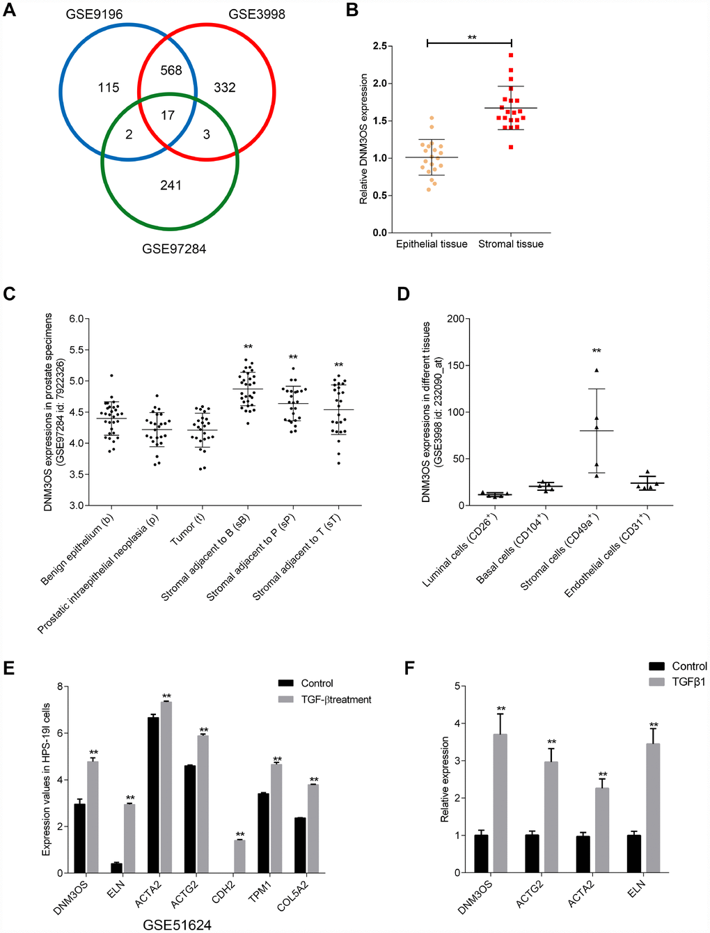 To identify lncRNAs that are related to BPH, we downloaded the microarray profiles GSE9196, GSE3998, and GSE97284 from GEO to investigate specifically-upregulated lncRNAs in prostate stroma, compared to prostate epithelium (log2FC >= 0.56, P < 0.05). As shown in Figure 1A, a total of 17 lncRNAs were identified in all three microarray profiles to be upregulated in prostate stroma that included FGF7P3, FGF7P2, MEG8, RF00019, FGF7P5, FGF7P4, FGF7P1, DNM3OS, MIR99AHG, GBP1P1, CARMN, MEG3, FGF7P8, SNORD114-3, FGF7P6, CES1P1 and DIO3OS. The expression of these 17 lncRNAs in prostate stromal and epithelial tissue samples was examined. As shown in Figure 1B and Supplementary Figure 1A–1B, the expression of MEG8, FGF7P4, GBP1P1, FGF7P6, DIO3OS, and DNM3OS were significantly upregulated in prostate stromal tissues, and DNM3OS expression was the most upregulated.