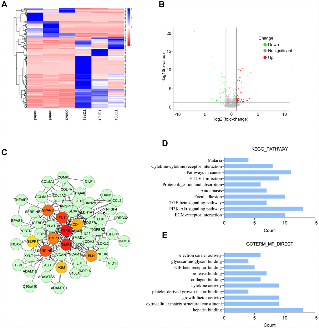 To identify differentially-expressed genes in PrSCs in response to TGFβ1 stimulation, we performed microarray profiling analyses. Hierarchical clustering analyses represented the expression of differentially-expressed genes in PrSCs with or without TGFβ1 treatment (Figure 2A). The distribution of gene expression differences is demonstrated as a volcano plot in Figure 2B. The volcano plot showed obvious differences in the distribution of differentially-expressed genes between two samples. The abscissa indicates the fold-change (shown as log2 fold-change). The ordinate indicates the p-value in the t-test (shown as -log10 p-value). The more significant the difference was the farther the numerical point is from the origin point. Thus, the most significantly differentially-expressed genes were distributed in the upper left and upper right corners. The most prominent gene for up-regulation is COL3A1. COL3A1 is a key marker of myofibroblasts and an important factor involved in TGFβ-mediated remodeling of the ECM; its expression was increased by at least 2 times (Log2FC ≥ 1, P < 0.05). Next, we used the STRING database to establish a protein-protein interaction (PPI) network of 108 key upregulated and downregulated genes. Network visualization was conducted by Cytoscape and the key nodes were analyzed using the Hub gene plug-in in Cytoscape. We found that 10 genes, that included TGFB1, CD44, FN1, SPARC, TIMP1, TIMP3, SEPPINE1, ELN, A2M and CD44, were at the core position of the PPI network comprised of the 108 genes (Figure 2C). KEGG signaling pathway annotation indicated that these genes were most enriched in the PI3K/AKT, cancer-related, ECM-receptor interaction, and focal adhesion signaling pathways (Figure 2D). GO enrichment analyses indicated that these genes were the most enriched in heparin binding, cytokine activity, growth factor activity, and extracellular matrix structural constituent (Figure 2E). Based on these data, COL3A1 was selected for further experiments due to its close association with TGFβ-mediated differentiation into and activation of myofibroblasts.
