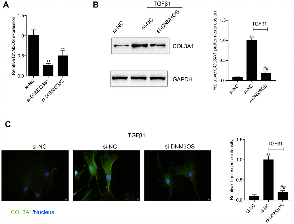 DNM3OS silencing decreases the protein level of COL3A1 upon TGFβ1 stimulation