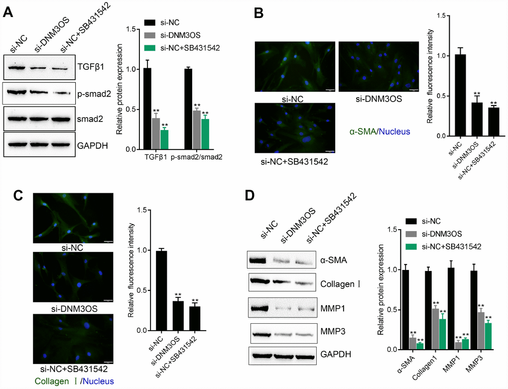 As we have mentioned, COL3A1 is an important factor involved in TGFβ-mediated myofibroblast functions. Next, we investigated whether DNM3OS could modulate TGFβ1 downstream signaling and TGFβ1-mediated ECM component changes. PrSCs were transfected with si-DNM3OS or treated with SB431542, an inhibitor of TGFβ1, and examined for the protein levels of TGFβ1, p-Smad2, Smad2, α-SMA, Collagen I, MMP1, and MMP3. As shown in Figure 5A–5D, DNM3OS silencing significantly decreased the protein levels of these factors, as revealed by immunoblotting and IF staining, which was similar to the effect of SB431542. These data indicate that, in addition to its effect on the miR-29a/29b-COL3A1 axis, DNM3OS might also modulate TGFβ1 to exert its effects on PrSCs.