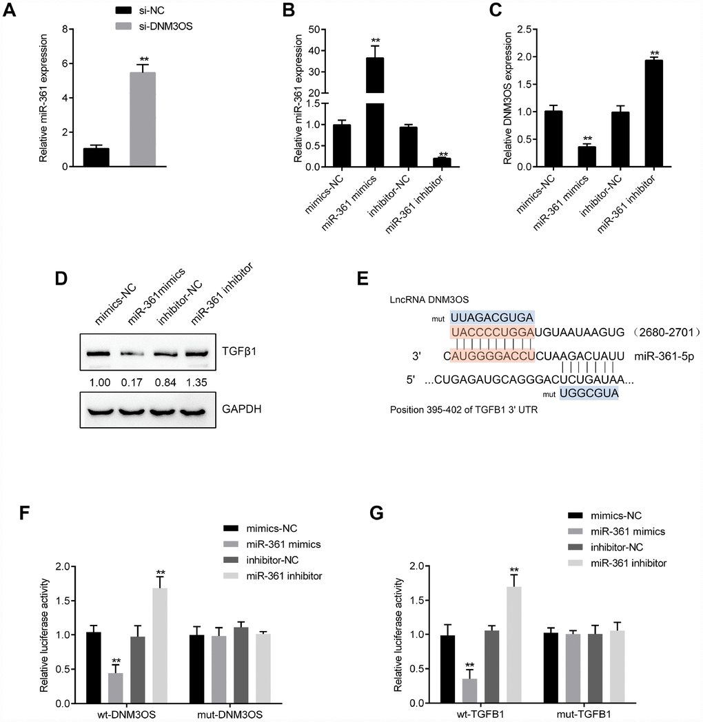 miR-361 directly binds DNM3OS and TGFβ1 to inhibit their expression