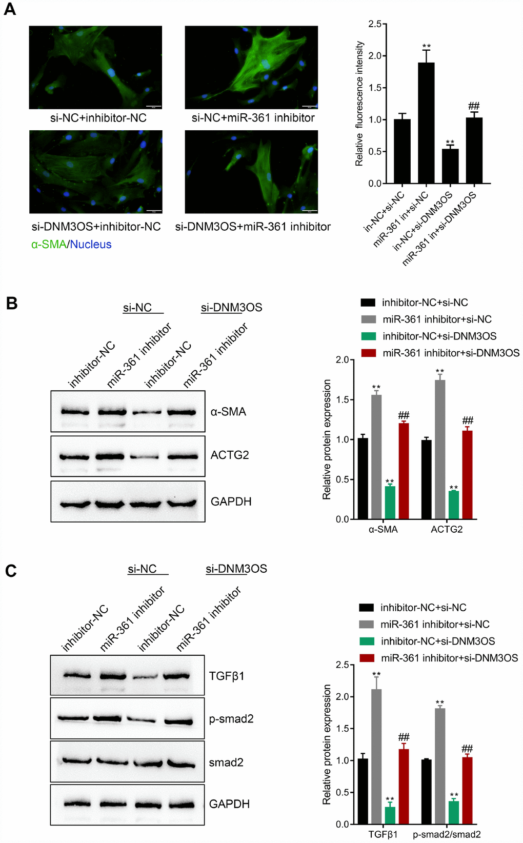 After confirming the predicted binding of miR-361 to DNM3OS and TGFβ1, we validated whether DNM3OS exerts its effects on TGFβ1, ECM components, and TGFβ1 downstream signaling via miR-361. PrSCs were cotransfected with si-DNM3OS and miR-361 inhibitor and examined for the protein levels of α-SMA, ACTG2, TGFβ1, p-Smad2, and Smad2. As shown in Figure 7A–7C, miR-361 inhibitor increased, while DNM3OS silencing decreased the protein levels of these factors and the effects of DNM3OS silencing could be reversed by miR-361 inhibition. These data indicate that DNM3OS also serves as a ceRNA for miR-361 to counteract miR-361-mediated TGFβ1 suppression.