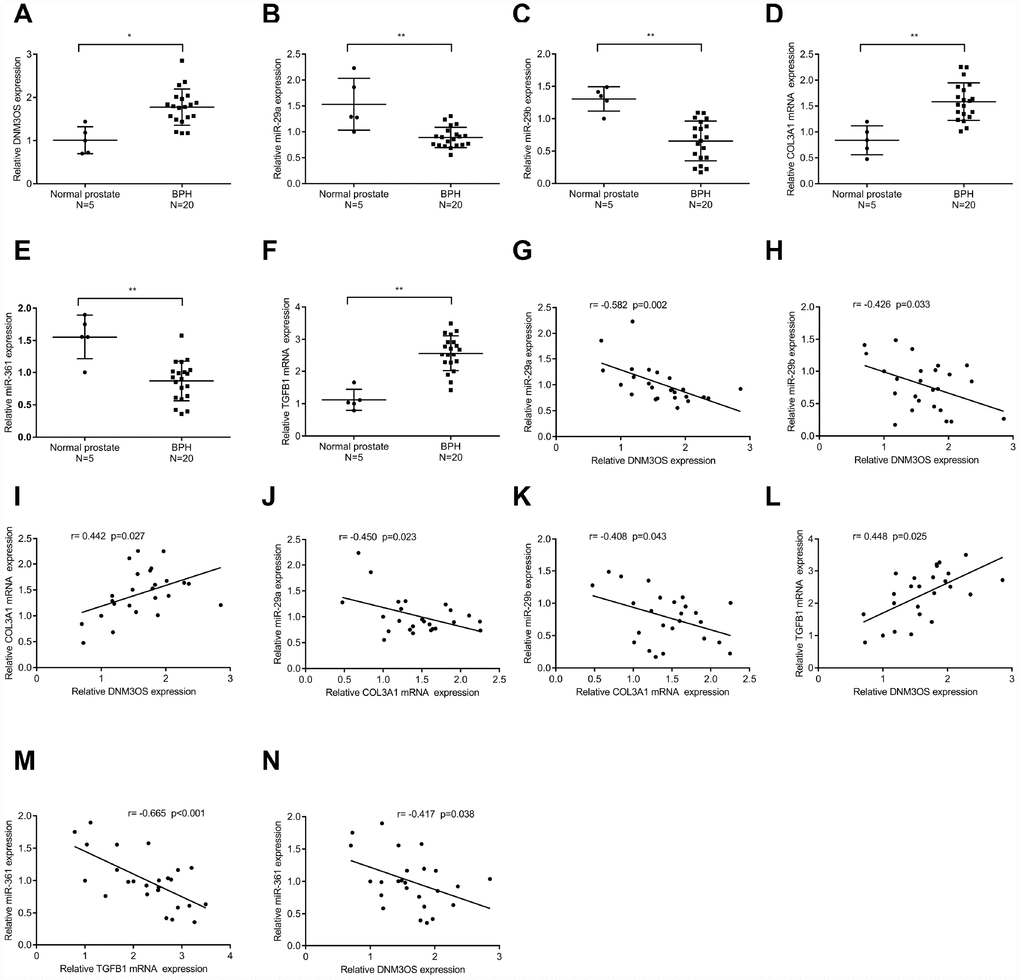 To further confirm the above findings, we examined the expression of DNM3OS, miR-29a/29b/361, COL3A1, and TGFβ1 in normal prostate stromal and BPH tissue samples. As shown in Figure 8A–8F, the expression of DNM3OS, COL3A1, and TGFβ1 was significantly upregulated, while miR-29a, miR-29b, and miR-361 expression was significantly downregulated in BPH tissues, compared to normal prostate tissues. Moreover, DNM3OS was negatively correlated with miR-29a, miR-29b, and miR-361; COL3A1 was negatively correlated with miR-29a and miR-29b; TGFβ1 was negatively correlated with miR-361; and DNM3OS was positively correlated with COL3A1 and TGFβ1 (Figure 8G–8N). These data indicate that DNM3OS could promote TGFβ1-mediated myofibroblast activation in PrSCs by counteracting the miR-29a/29b-mediated COL3A1 suppression and miR-361-mediated TGFβ1 suppression.