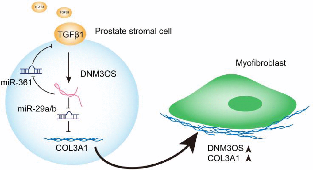 In conclusion, we identified DNM3OS as a specifically-upregulated lncRNA upon TGFβ1 stimulation in PrSCs; via serving as a ceRNA for miR-29a/29b cluster and miR-361, DNM3OS abolished the miRNA-mediated suppression of COL3A1 and TGFβ1, thereby promoting TGFβ1-induced PrSC transformation into myofibroblasts (Graphical abstract).