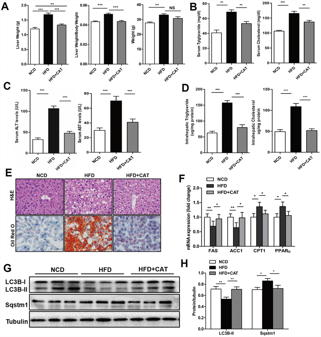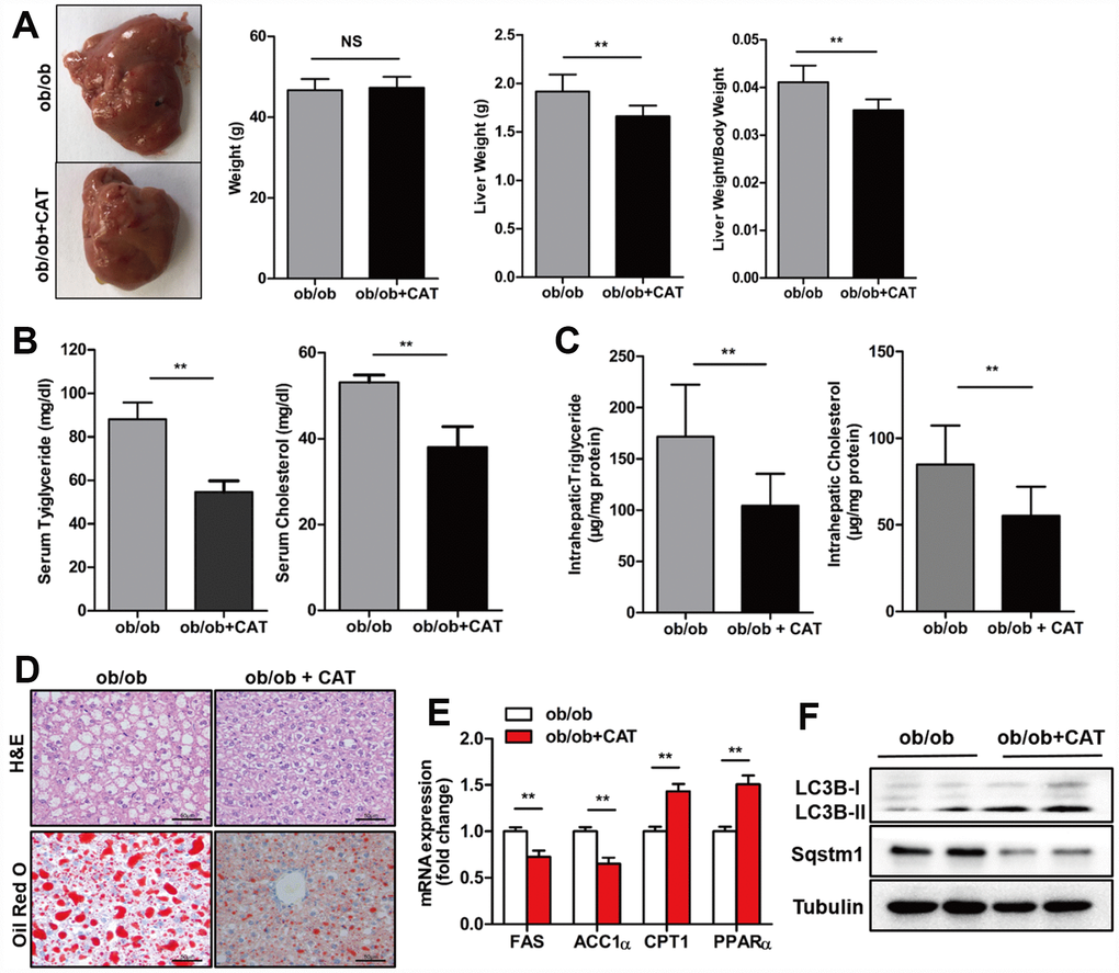 In addition, CAT has been reported to ameliorate inflammation and promote autophagy [17] and might therefore represent a novel treatment strategy for obesity-related metabolic disorders. Here, we investigated the effects of CAT on both hepatic steatosis in ob/ob and HFD-induced mice and on autophagy and lipid metabolism pathways.
