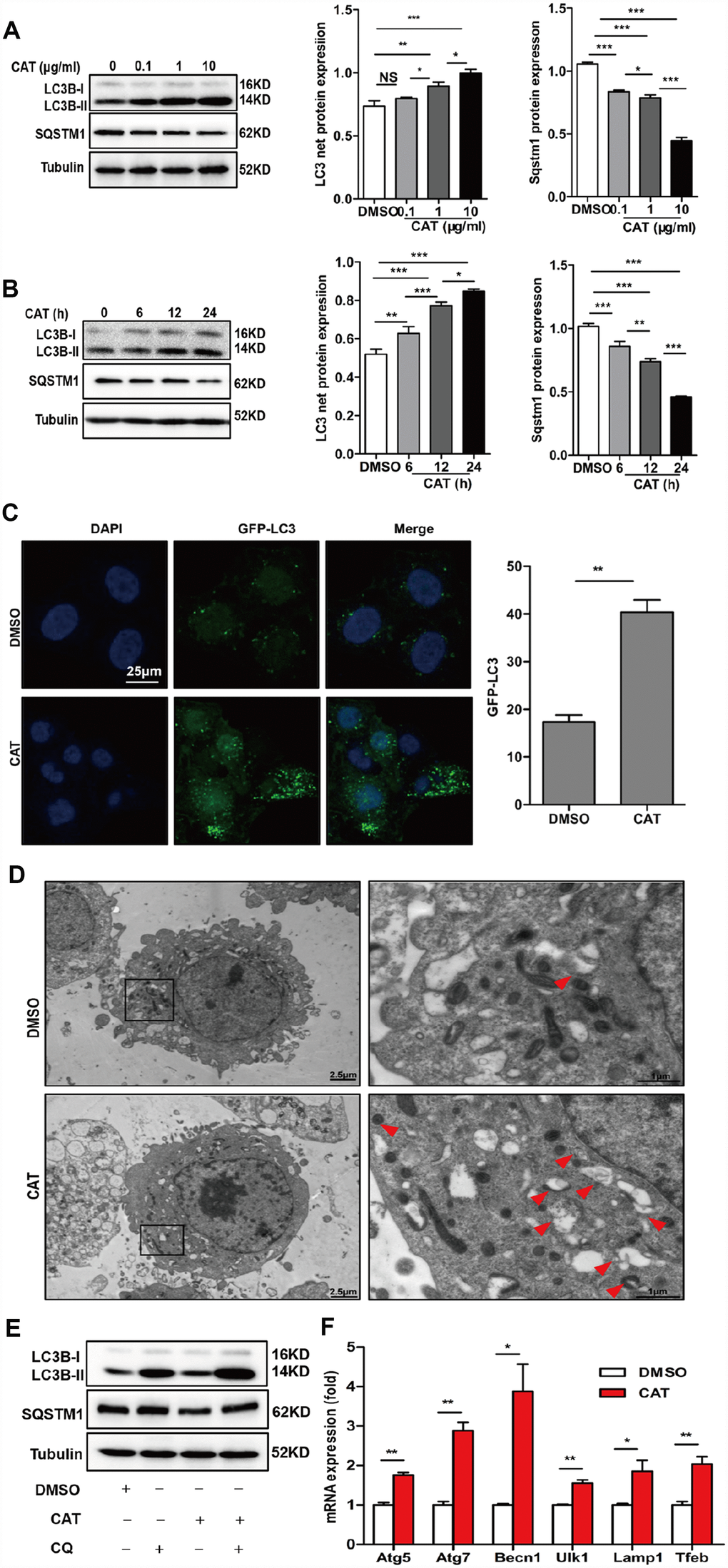 Previous reports have suggested that autophagy plays a crucial role in hepatic steatosis and that it is suppressed in the livers of NASH patients and HFD mice. To evaluate the effects of CAT on autophagy, hepatic steatosis, and the underlying mechanisms, HepG2 cells were exposed to different concentrations (0.1, 1, or 10 μg/mL) of CAT for 24 h or treated with 10 μg/mL CAT for 6, 12, or 24 h. CAT treatment increased LC3-II levels and decreased SQSTM1/p62 levels in a dose- and time- dependent manner (Figure 3A, 3B). We next evaluated the effect of CAT on autophagy using fluorescence microscopy in GFP-LC3 transduced hepatocytes. LC3-II levels markedly increased in response to 24 h of CAT administration (Figure 3C). Additionally, electron microscopy revealed that more autophagic vacuoles formed in hepatocytes treated with CAT compared to controls (Figure 3D). To investigate the effects of CAT on autophagy flux, HepG2 cells were treated with CAT for 24 h with or without CQ (50 μM). Following exposure to CAT, LC3B-II levels increased, and SQSTM1/p62 levels decreased, in hepatocytes. CQ alone significantly increased LC3-II and SQSTM1/p62 levels, while coadministration with CAT further increased LC3-II levels and decreased SQSTM1/p62 accumulation (Figure 3E). Consistent with that result, GFP-LC3-II expression levels decreased, while free-GFP expression levels increased, in hepatocytes treated with CAT (Supplementary Figure 2). We also observed that CAT significantly upregulated autophagy-related genes (including Atg7, Atg5, Becn1, Ulk1, and Lamp1) and TFEB in HepG2 cells (Figure 3G). Together, these data indicate that CAT enhanced autophagy in hepatocytes.