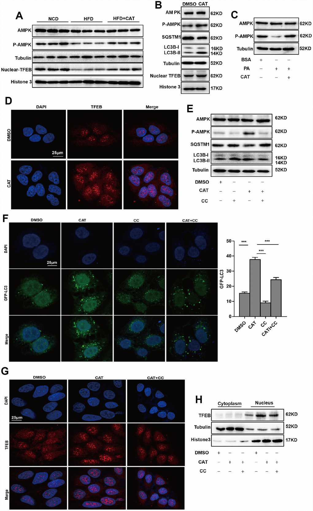Previous studies report that AMPK activates autophagy and reduces lipid accumulation invivo and invitro [19, 20]; we therefore evaluated the effects of CAT on AMPK activation in HFD-fed mice (Figure 4A). Notably, CAT induced AMPK phosphorylation and activated autophagy in HepG2 cells (Figure 4B). In addition, AMPK phosphorylation, but not levels of AMPK itself, decreased significantly in the presence of PA and increased after CAT treatment (Figure 4C). TFEB activates the transcription of genes that promote lysosomal biogenesis and regulates autophagy upon translocation to the nucleus. We therefore examined whether CAT treatment activated autophagy by promoting translocation of TFEB. Western blot analysis showed that CAT increased nuclear TFEB translocalization in hepatocytes (Figure 4A, 4B. Nuclear TFEB levels in hepatocytes after CAT administration as determined by fluorescence analyses were consistent with these results (Figure 4D). We then tested whether AMPK was required for CAT-induced autophagy and nuclear TFEB translocation. Inhibition of AMPK by CC reduced autophagic activity as evidenced by decreased LC3-II levels and increased SQSTM1/p62 levels (Figure 4E) and by a significant decrease in the number of GFP-LC3-positive vesicles (Figure 4F). Furthermore, fluorescence analyses and Western blots indicated that CC abrogated CAT-induced nuclear translocation of TFEB (Figure 4G, 4H). Collectively, these findings indicate that CAT induces autophagy via an AMPK/TFEB-related pathway.