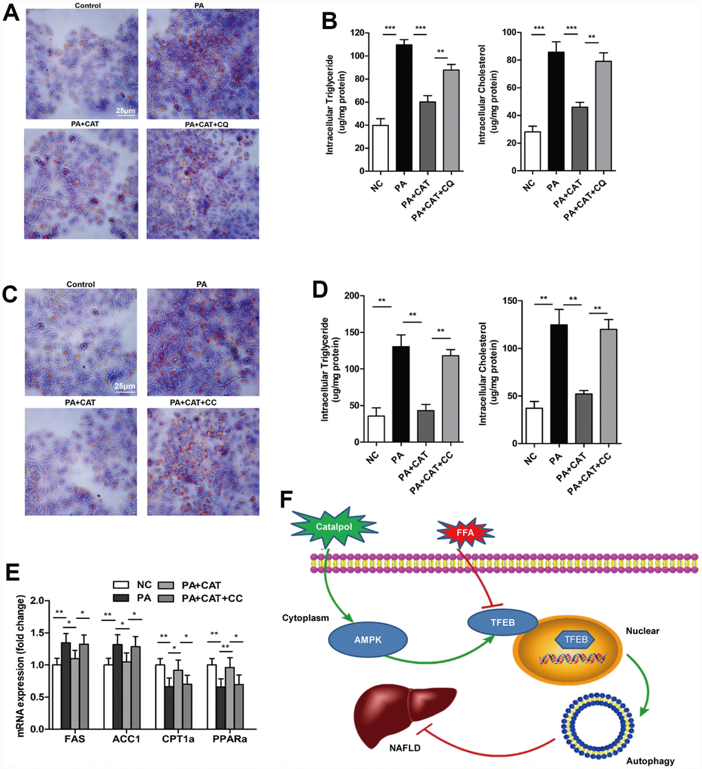 In conclusion, the results of this study suggest that CAT attenuates hepatic steatosis and lipotoxicity by inducing autophagy via AMPK activation and subsequent nuclear translocation of TFEB in a mouse model. CAT might therefore be a promising potential therapy for liver steatosis associated with obesity in animals, though its potential in human disease remains unproven.