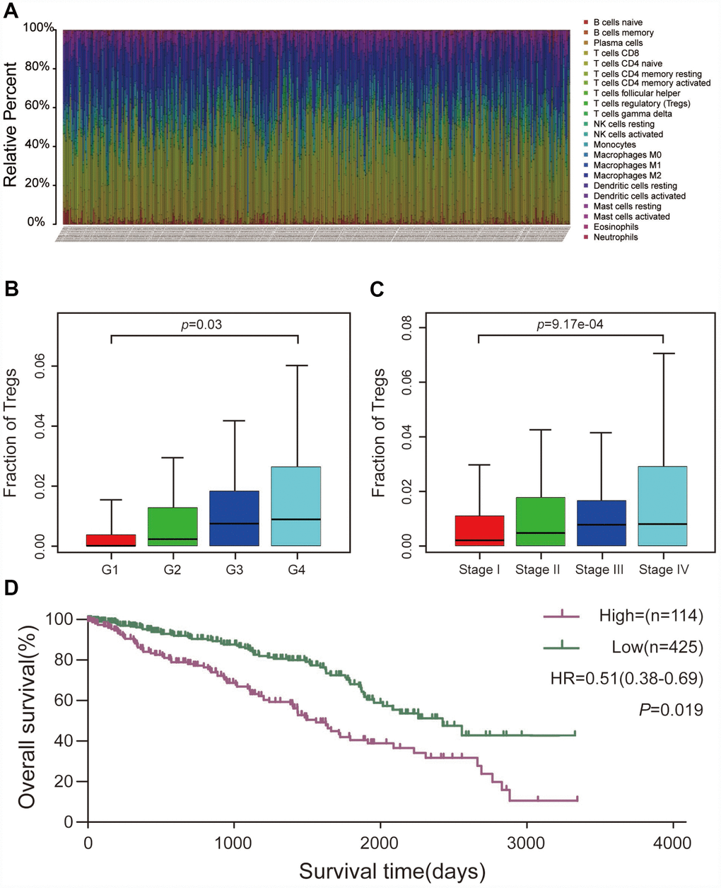 Using the CIBERSORT algorithm, we investigated the 22 subpopulations of infiltrating immune cells. Figure 1A summarizes the results obtained from 539 ccRCC samples. Data relating to age, gender, pathological grade, American Joint Committee on Cancer (AJCC) stage, and survival state were collected and are summarized in Table 1. The results showed that a higher proportion of Treg cells was associated with a higher pathological grade and a more advanced AJCC stage (Figure 1B and 1C). Additionally, patients with a high proportion of infiltrating Treg cells had a poorer prognosis than those with a low proportion (Figure 1D).