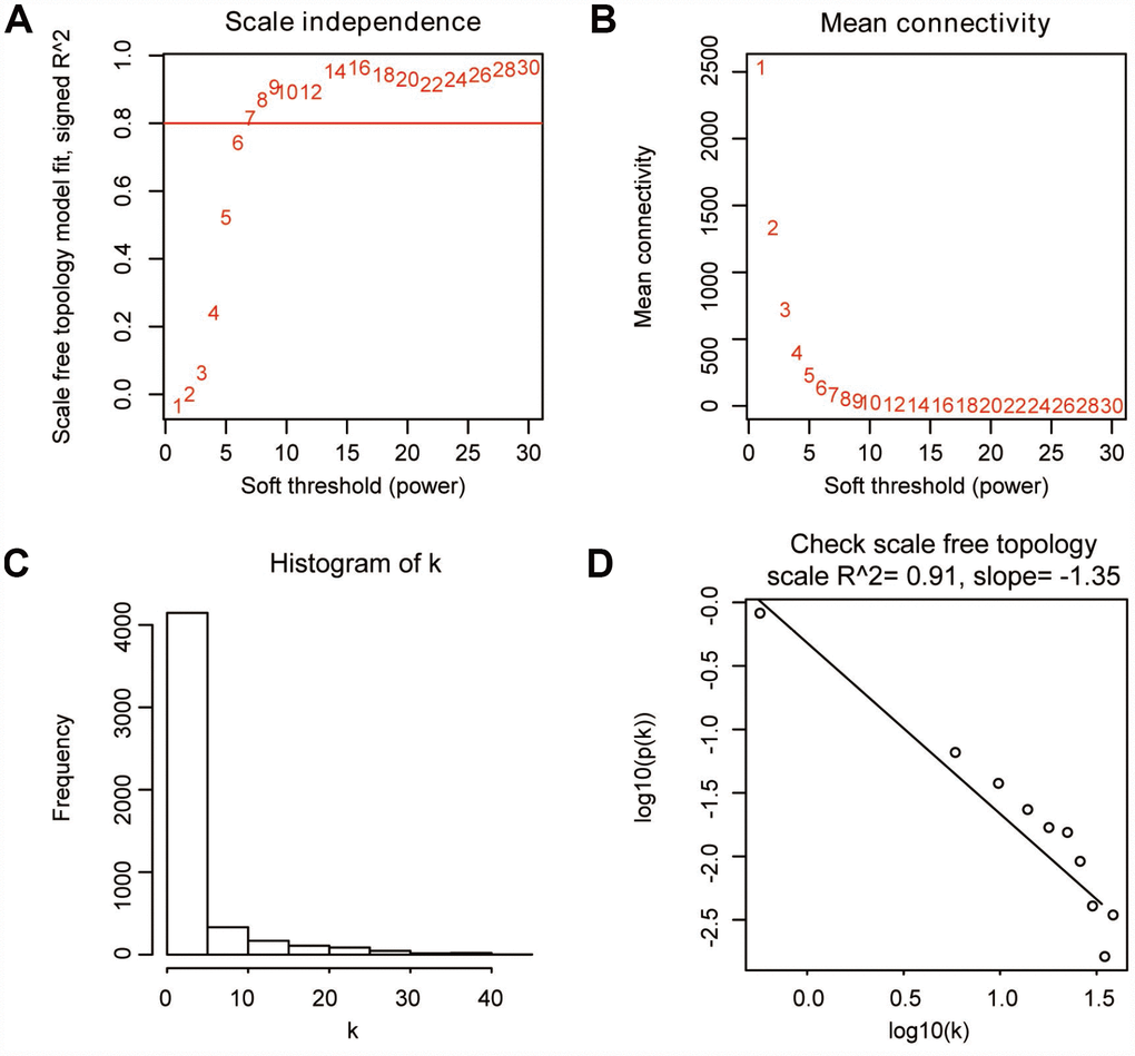 The expression profile data of DEGs was tested to check if they were good samples and genes. Then, we used the “WGCNA” R package to construct a scale-free co-expression network for the DEGs. The Pearson’s correlation matrices and average linkage method were both performed for all pair-wise genes. Then, a weighted adjacency matrix was constructed using a power function amn = |cmn|β (cmn = Pearson’s correlation between gene m and gene n; amn = adjacency between gene m and gene n). β was a soft-thresholding parameter that could emphasize strong correlations between genes and penalize weak correlations. After choosing the power of β, the adjacency was transformed into a topological overlap matrix (TOM), which could measure the network connectivity of a gene defined as the sum of its adjacency with all other genes for network generation, and the corresponding dissimilarity (1-TOM) was calculated [40]. To classify genes with similar expression profiles into gene modules, average linkage hierarchical clustering was conducted according to the TOM-based dissimilarity measure with a minimum size (gene group) of 50 for the genes dendrogram.