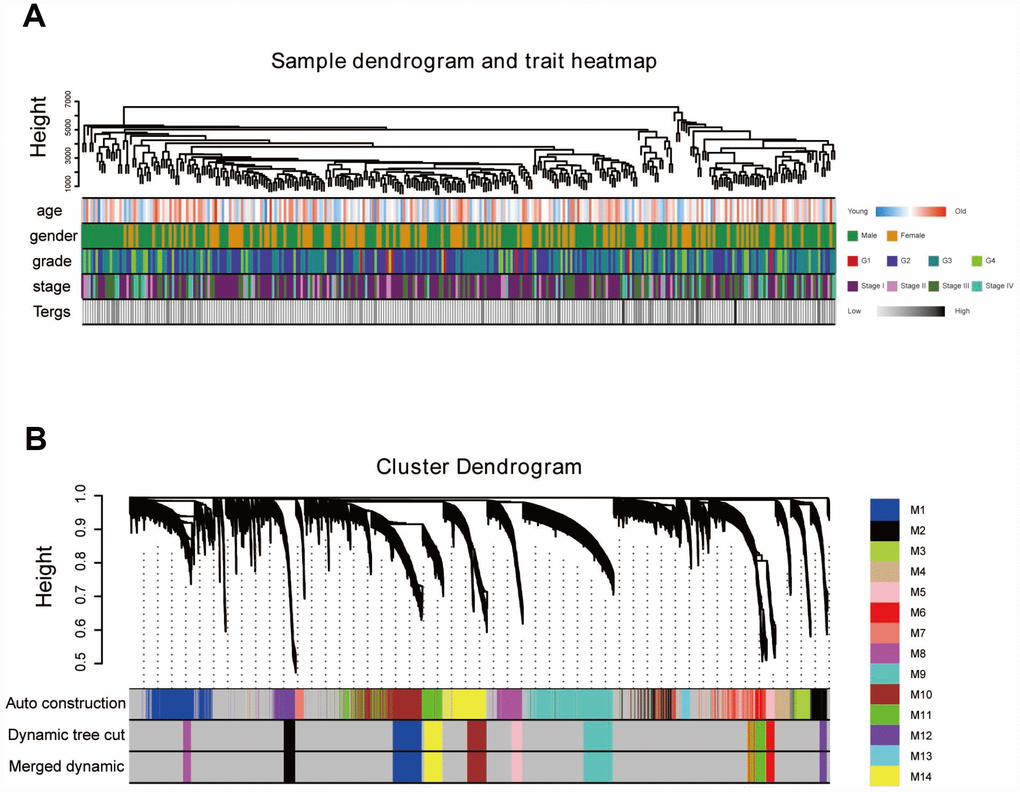 Two approaches were used to identify modules related to clinical traits of ccRCC. Firstly, gene significance (GS) was defined as the log10 transformation of the P value (GS = lgP) in the linear regression between gene expression and the clinical traits. In addition, module significance (MS) was defined as the average GS for all the genes in a module. Then, the module with the absolute MS ranked first among all the selected modules was considered as the one related to clinical traits. The module eigengene (ME) was considered as the major component in the principal component analysis for each gene module, and the expression patterns of all genes could be summarized into a single characteristic expression profile within a given module. In addition, we calculated the correlation between each ME and clinical traits to identify the relevant module. The module with the maximal absolute MS among all the selected modules was usually considered as the one related to clinical traits. Finally, the module highly correlated with certain clinical traits was selected for further analysis.