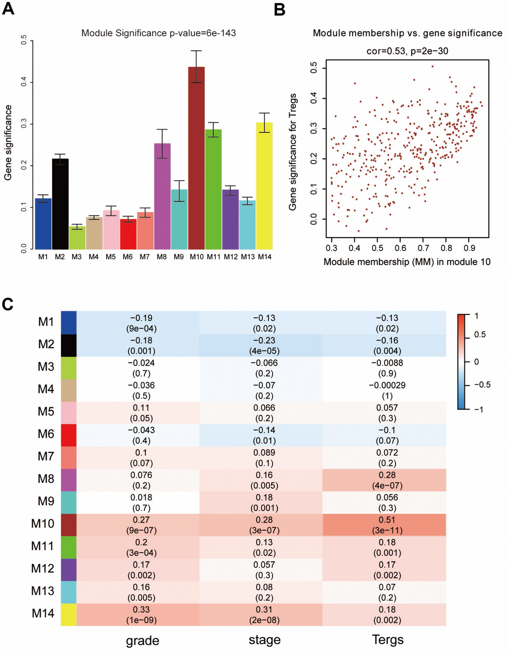 “WGCNA” R package was used to categorize the DEGs with similar expression patterns into modules by average linkage clustering, based on the 432 cases with eligible CIBERSORT data. Firstly, we selected the power of β=9 (scale free R2=0.91) as the soft-thresholding parameter (Figure 2A, 2B); Figure 2C and 2D shows the positive result of the rationality test. After that, a sample dendrogram was constructed based on the similarity between the samples and the clinical characteristics of each sample are shown (Figure 3A). Finally, fourteen modules were identified (Figure 3B). We used two methods to test the relevance between each module and the fraction of Treg cells. Modules with a greater MS were considered to have more connection with Treg cells, and we found that the MS of module 10 was higher than any other module (Figure 4A). Afterwards, the ME of module 10 showed a higher correlation with the fraction of Treg cells than other modules (Figure 4C). Based on the two methods, we finally identified module 10 was the module most relevant to Treg cells in ccRCC (Figure 4B).
