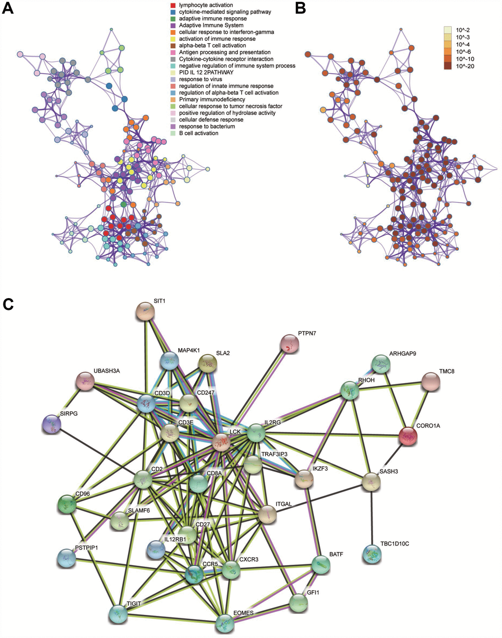 We performed a functional enrichment analysis to search for the biological processes and pathways relevant to the module 10 using Metascape. The results showed that the biological processes and pathways were mainly related to activation of the immune system and the processes of immunoreactions (Figure 5A and 5B).